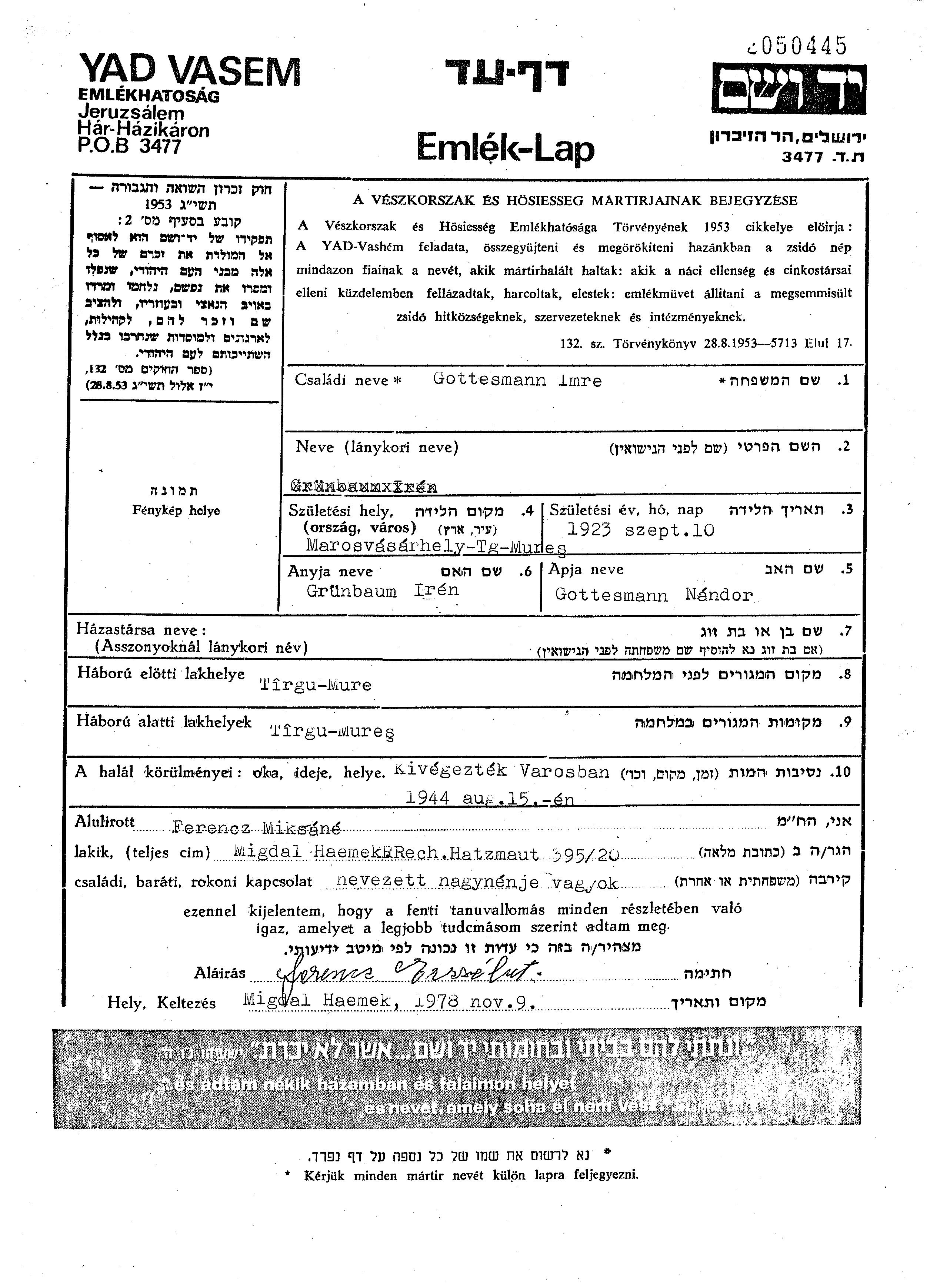 Gottesmann Imre 1923 Targu Mures, Rumänien Gedenkblatt