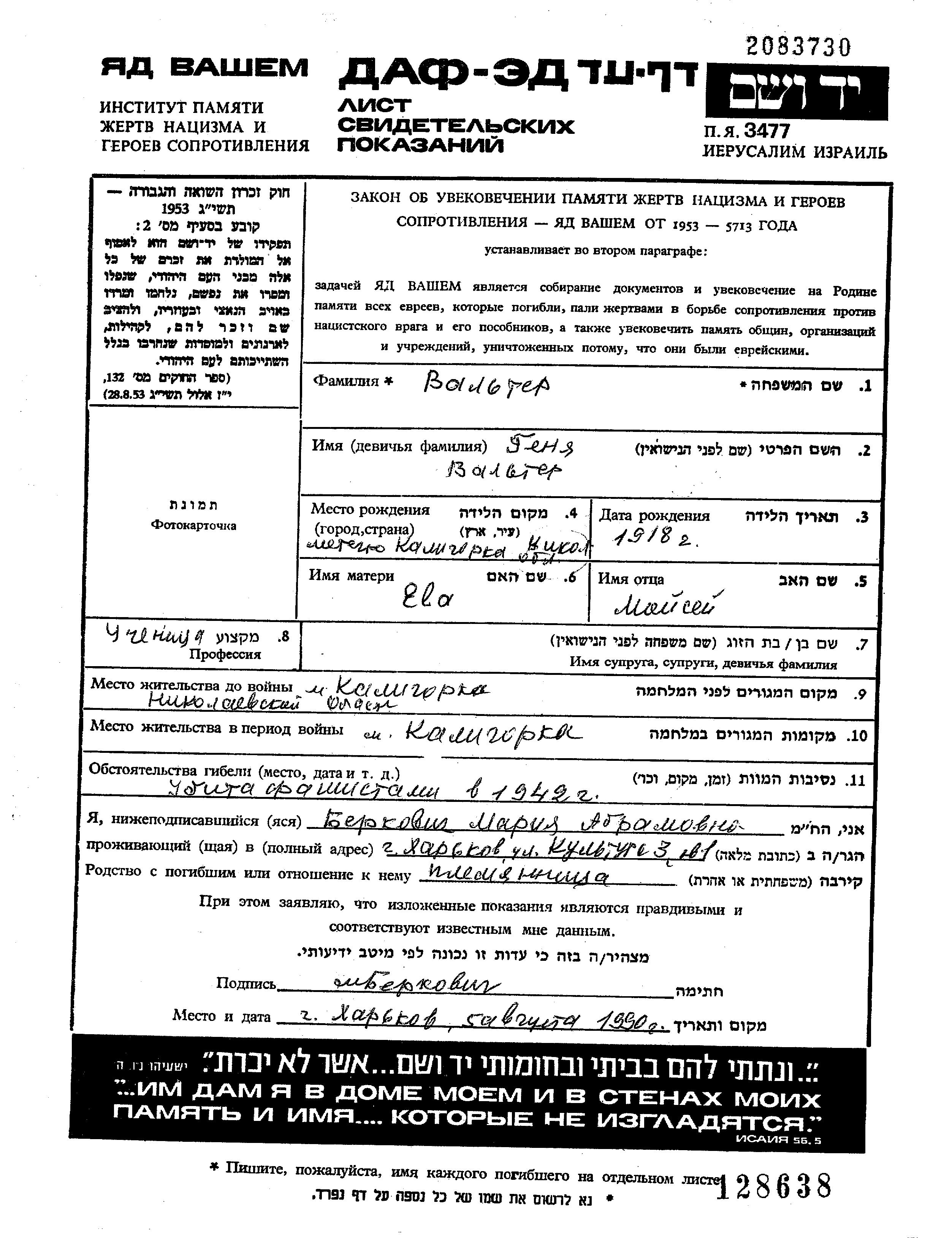 Genya Valter wurde in Kaligorka, Ukraine (UdSSR) geboren. Sie war die Tochter von Moisei und Yeva. Sie war Student und Ledig. Vor dem Zweiten Weltkrieg lebte sie in Kaligorka, Ukraine (UdSSR). Während des Krieges war sie in Kaligorka, Ukraine (UdSSR).