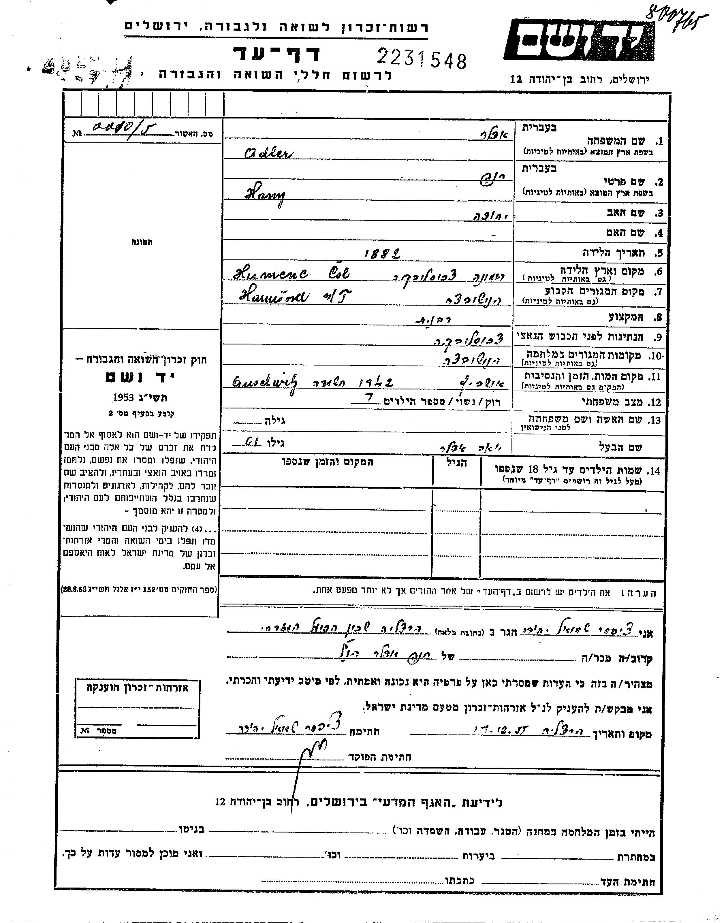 Hany Adler, geb. Zelder wurde im Jahr 1882 in Humenne, Tschechoslowakei geboren. Sie war die Tochter von Yehuda. Sie war mit Yoav Eugen Verheiratet. Vor dem Zweiten Weltkrieg lebte sie in Hanusovce, Tschechoslowakei. Während des Krieges war sie in Hanusovce, Tschechoslowakei.
