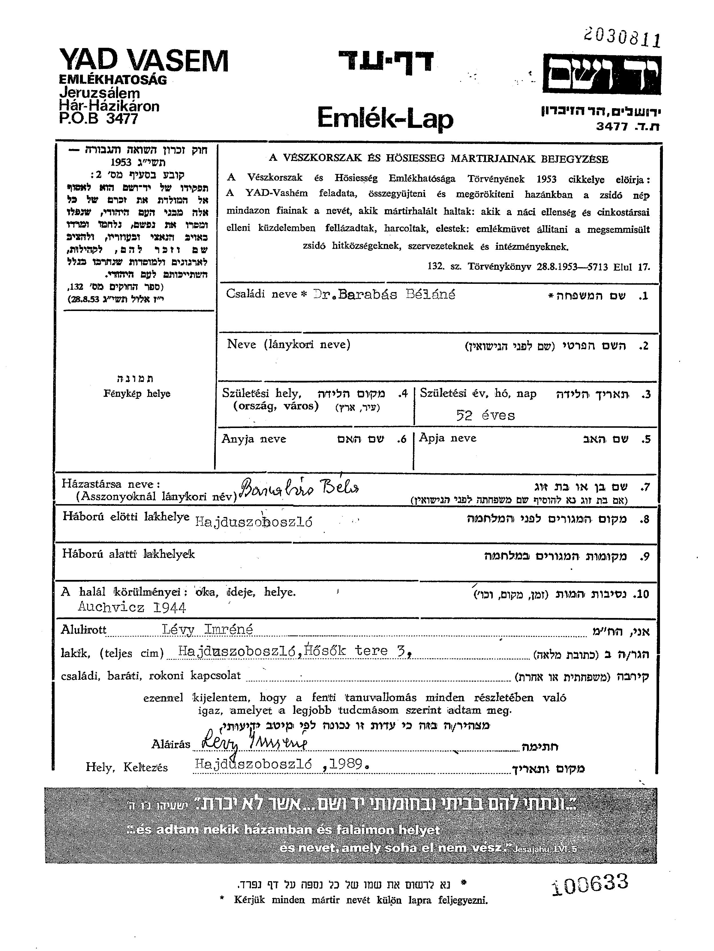Vorname unbekannt Barabas wurde im Jahr 1892 geboren. Sie war mit Bela Verheiratet. Vor dem Zweiten Weltkrieg lebte sie in Hajduszoboszlo, Ungarn.
