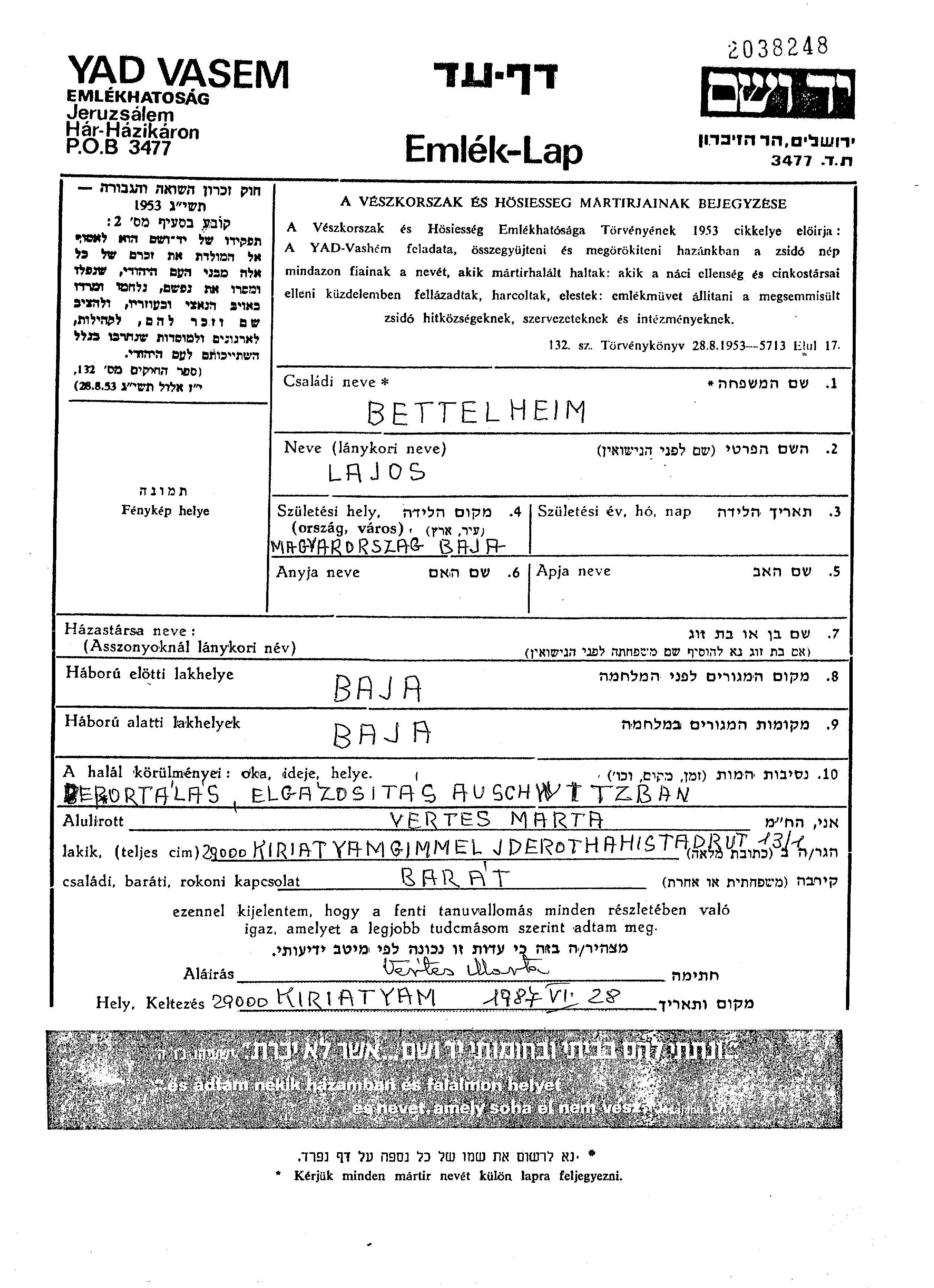 Lajos Bettelheim wurde in Baja, Ungarn geboren. Vor dem Zweiten Weltkrieg lebte er in Baja, Ungarn. Während des Krieges war er in Baja, Ungarn.