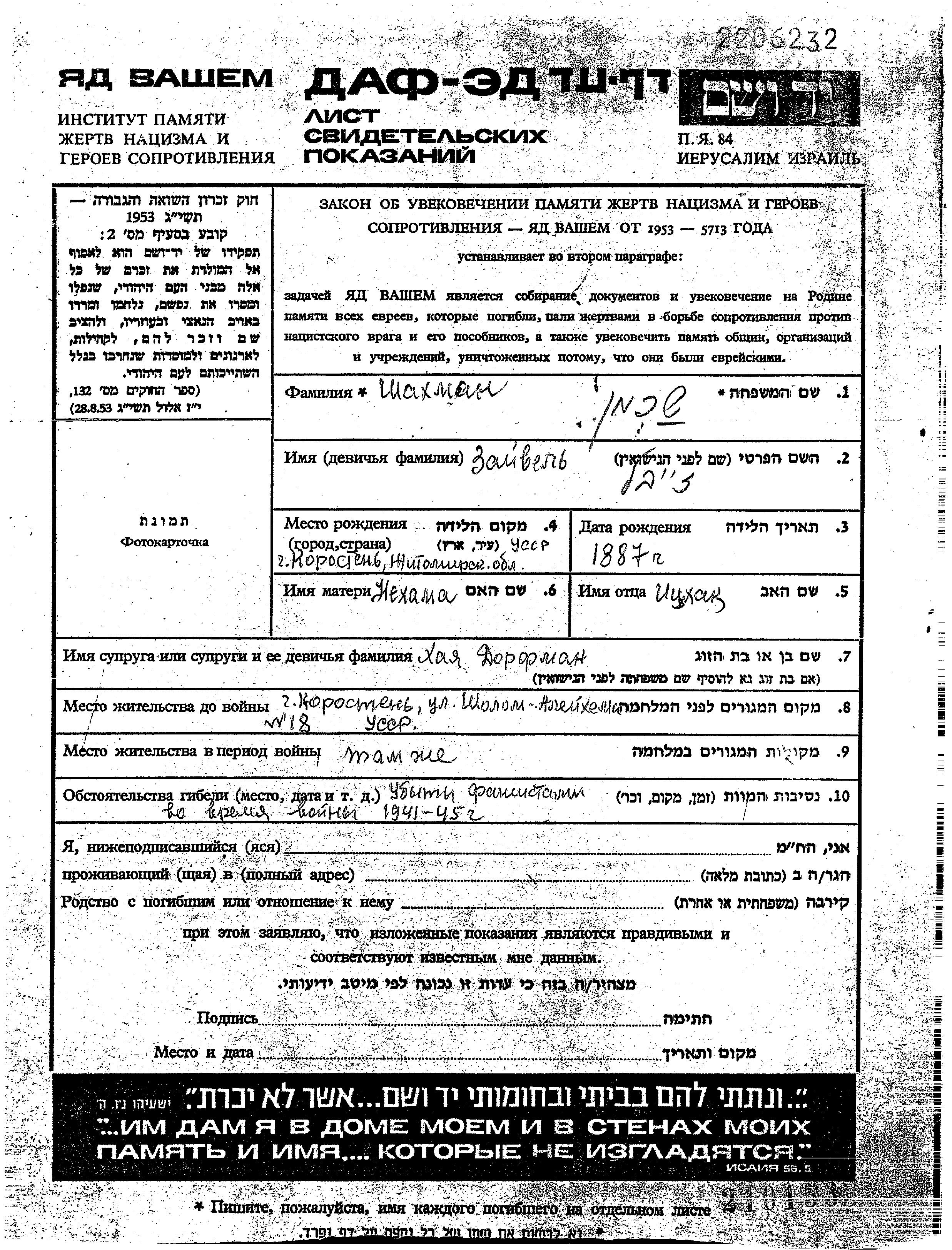 Zaivel Shachman wurde im Jahr 1887 in Korosten, Ukraine (UdSSR) geboren. Er war der Sohn von Itzhak und Nekhama. Er war mit Khaja Verheiratet. Vor dem Zweiten Weltkrieg lebte er in Korosten, Ukraine (UdSSR). Während des Krieges war er in Korosten, Ukraine (UdSSR).