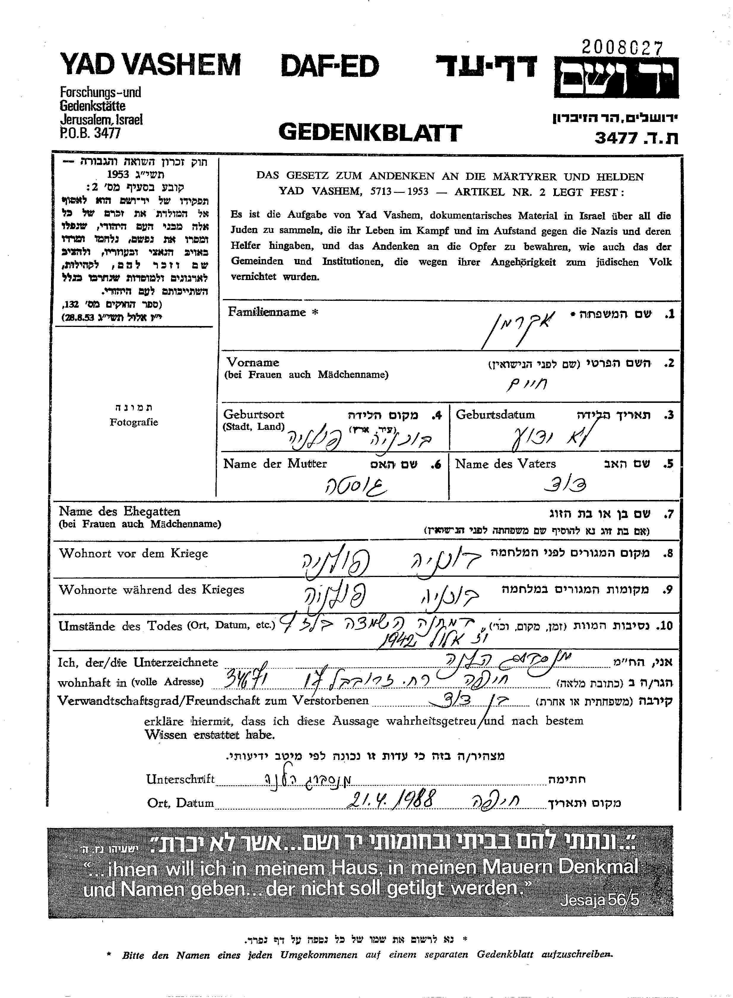 Akerman Khaim Bochnia, Polen Gedenkblatt