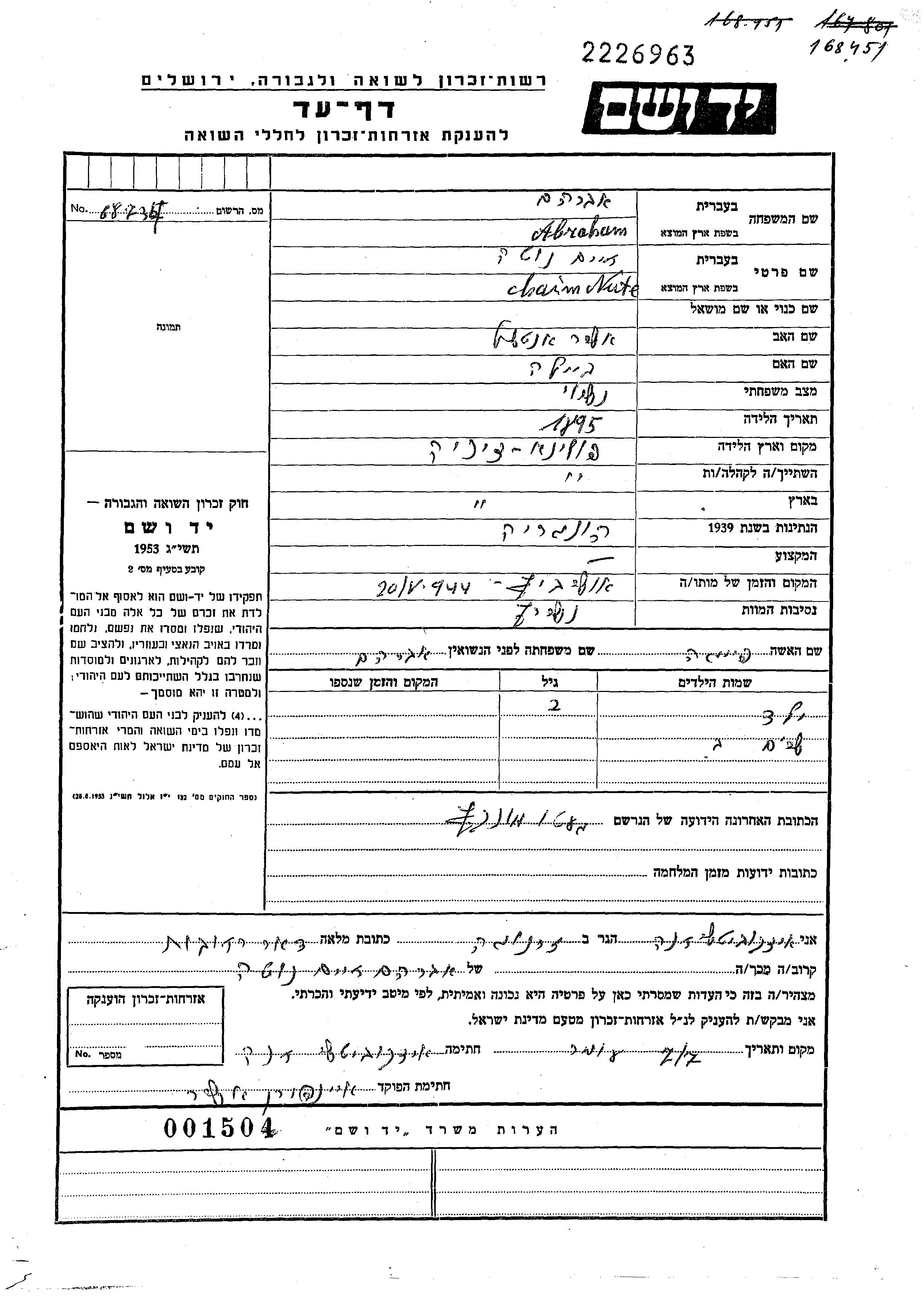 Chaim Nute Abraham wurde im Jahr 1895 in Poljana, Tschechoslowakei geboren. Er war der Sohn von User Ancel und Beila, geb. Eizdorfer. Er war mit Feiga Verheiratet. Vor dem Zweiten Weltkrieg lebte er in Poljana, Tschechoslowakei. Während des Krieges war er in Munkacs, Tschechoslowakei.