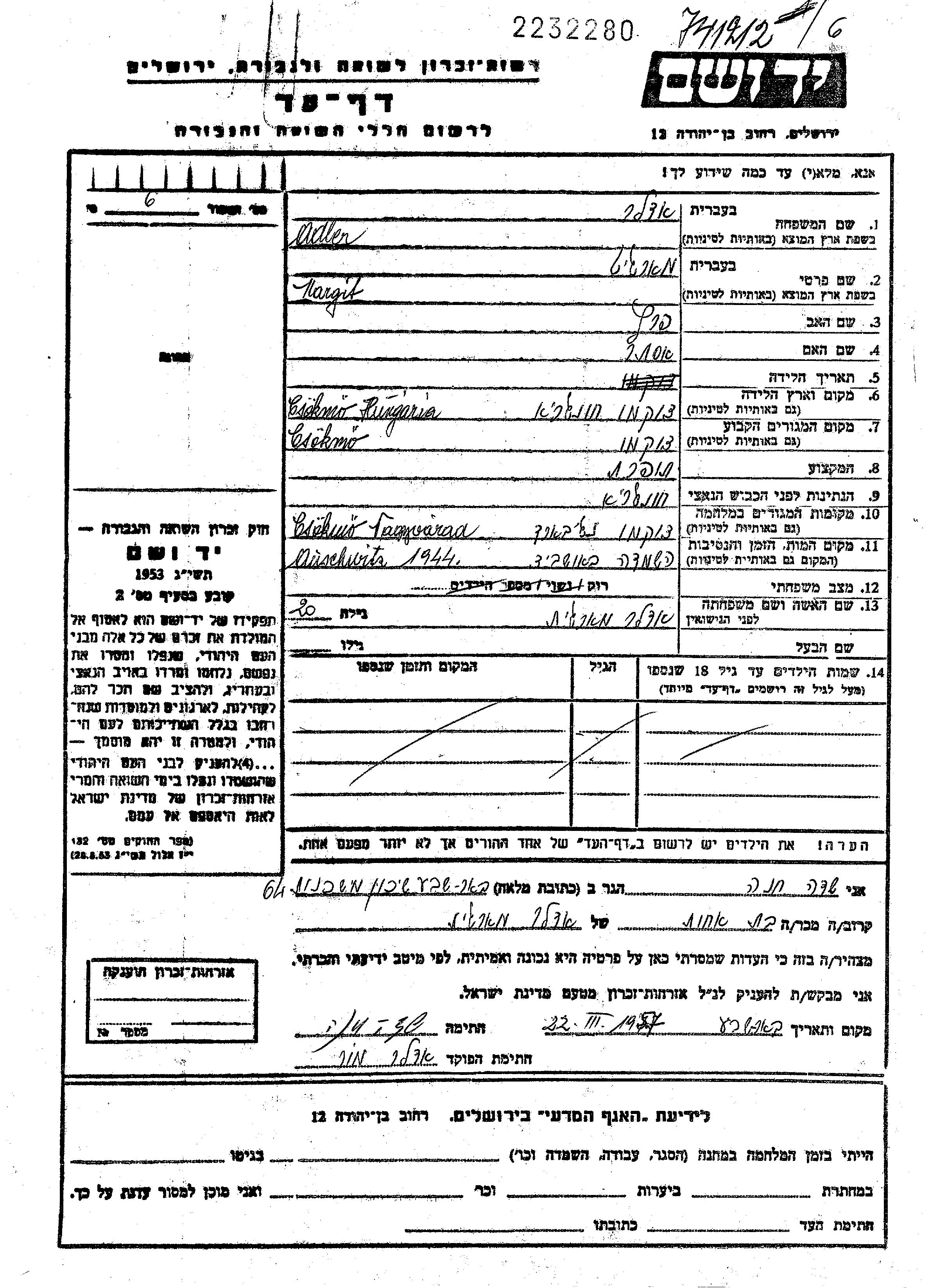 Margit Adler wurde in Csokmo, Ungarn geboren. Sie war die Tochter von Peretz und Eszter, geb. Gelman. Sie war Schneiderin und Ledig. Vor dem Zweiten Weltkrieg lebte sie in Csokmo, Ungarn. Während des Krieges war sie in Nagyvarad, Rumänien.