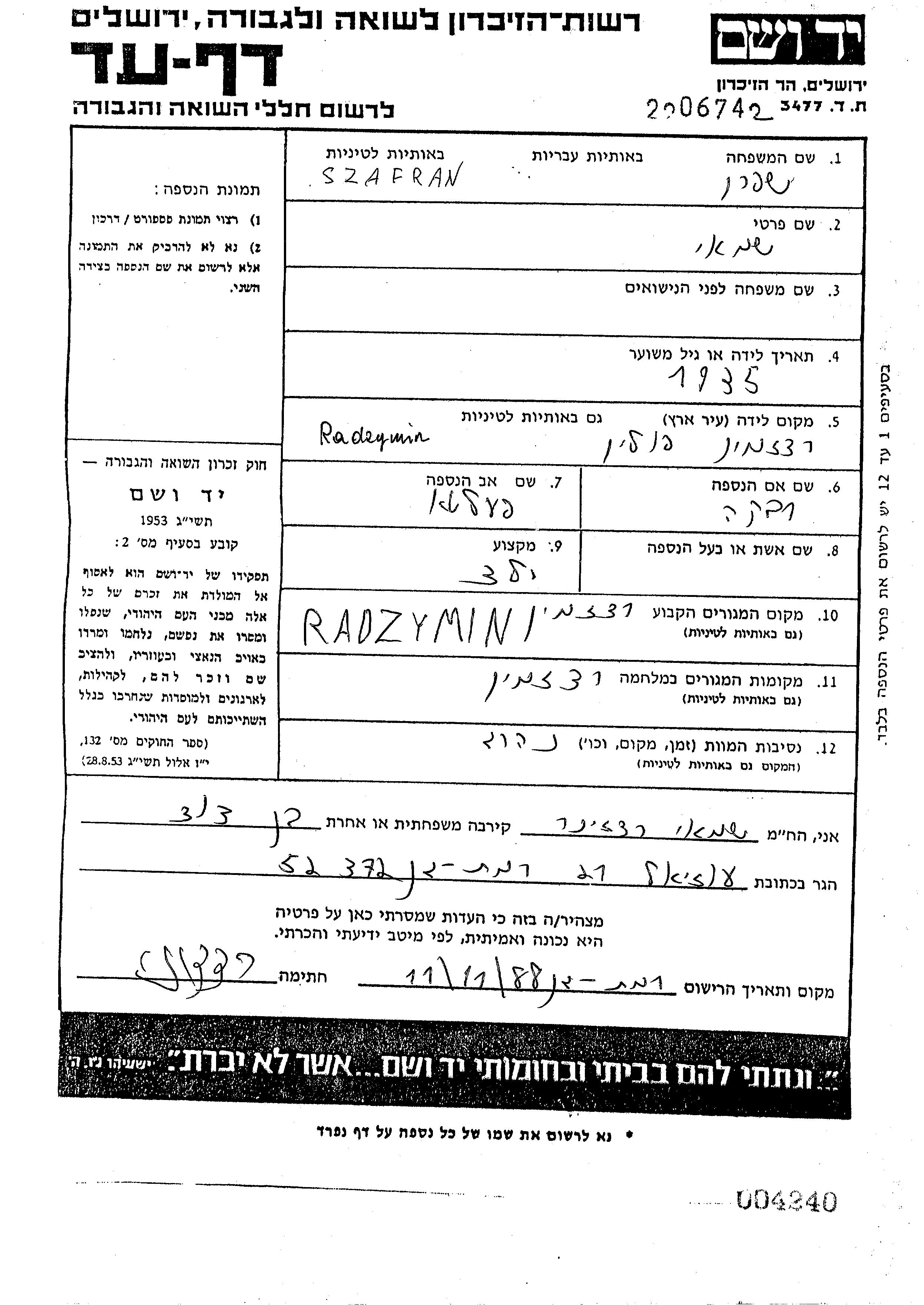 Shafran Shamai Radzymin, Polen Gedenkblatt