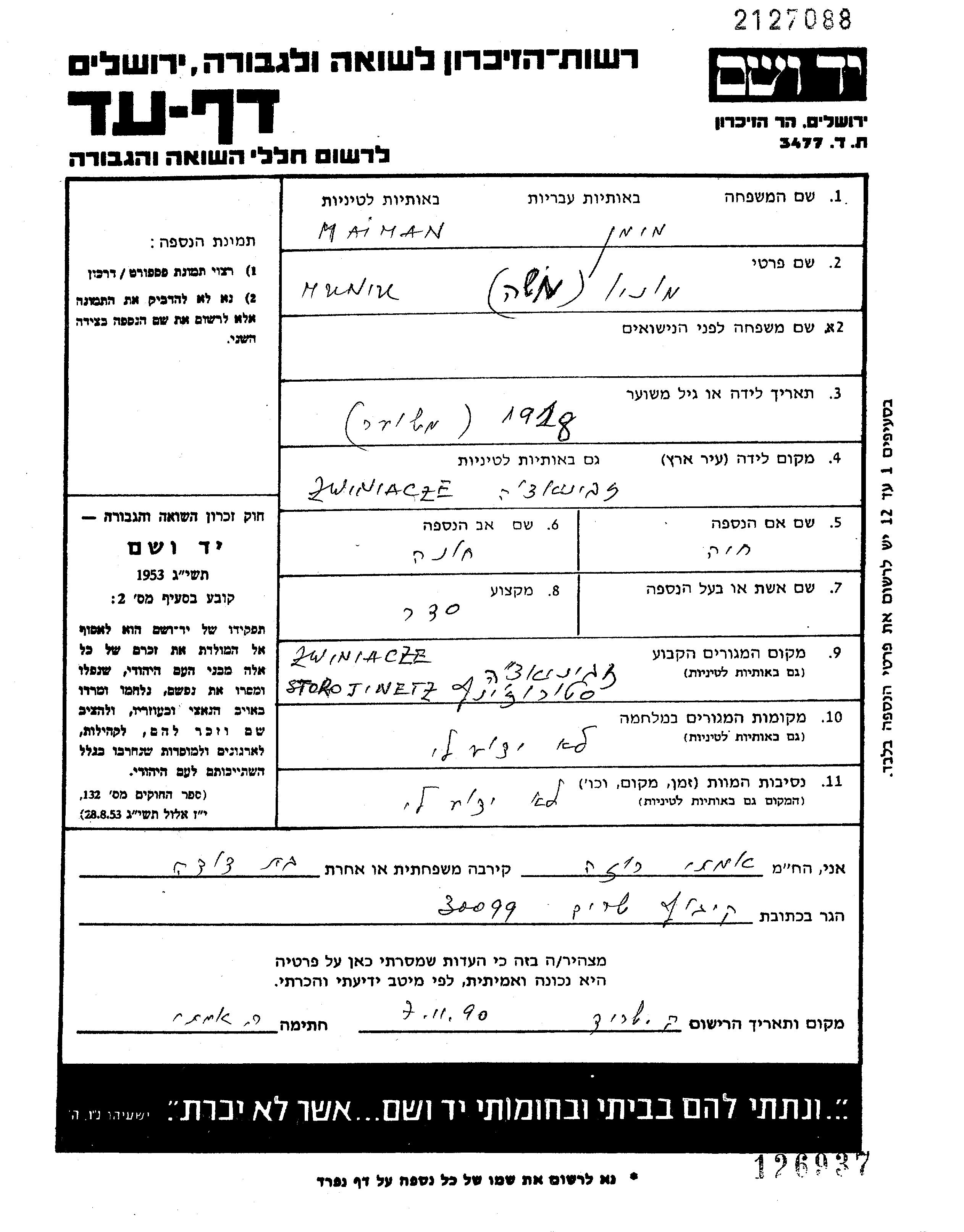 Muniu Moshe Maiman Miman wurde im Jahr 1918 in Zviniace, Rumänien geboren. Er war der Sohn von Khuna und Chaja, geb. Bred. Er war Direktor/-in. Vor dem Zweiten Weltkrieg lebte er in Storojinet, Rumänien.