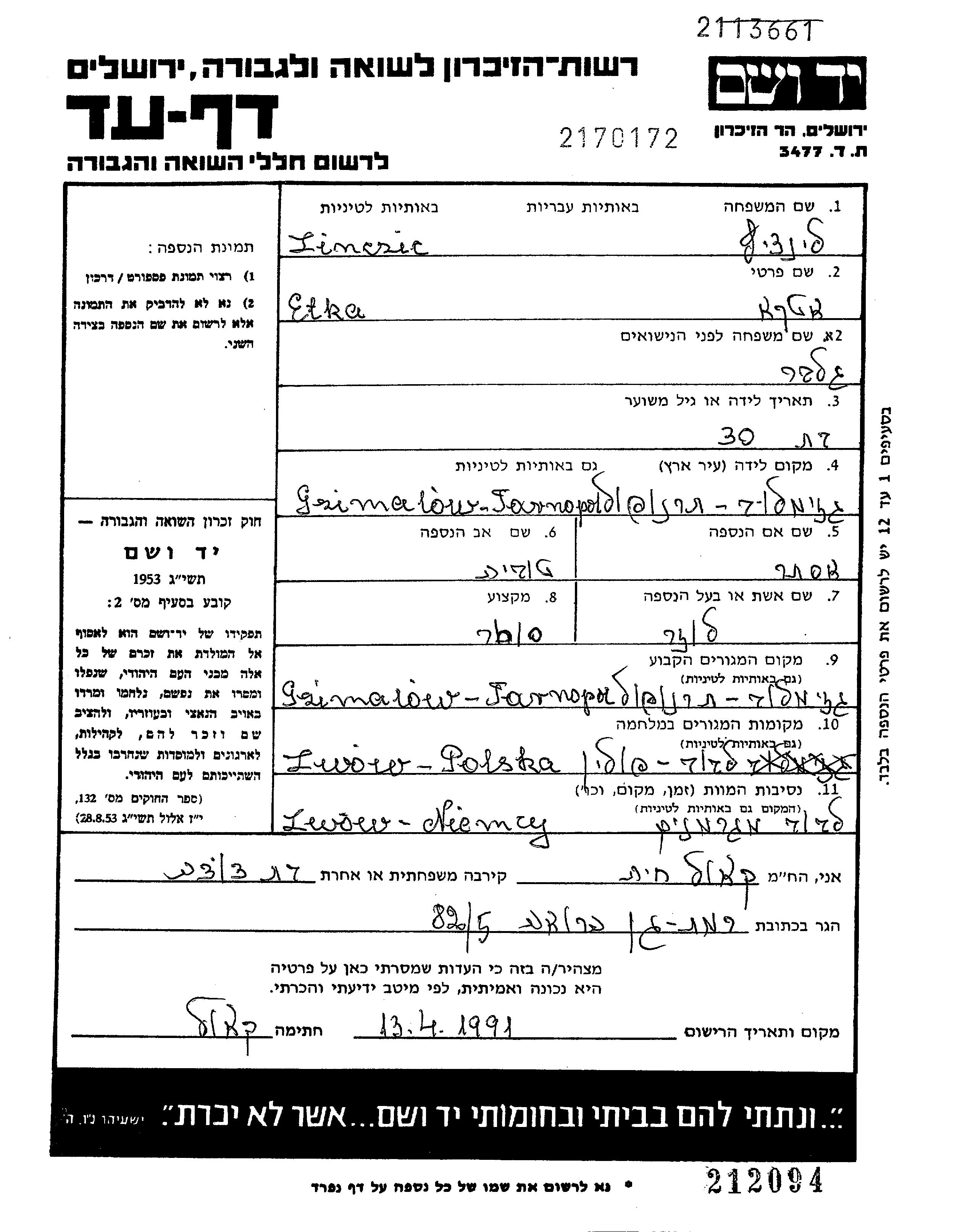 Etka Linczic, geb. Gelber wurde in Tarnopol, Polen geboren. Sie war die Tochter von Tovie und Ester. Sie war Kaufmann/-frau und mit Luzer Verheiratet. Vor dem Zweiten Weltkrieg lebte sie in Grzymalow, Polen. Während des Krieges war sie in Lwow, Polen.