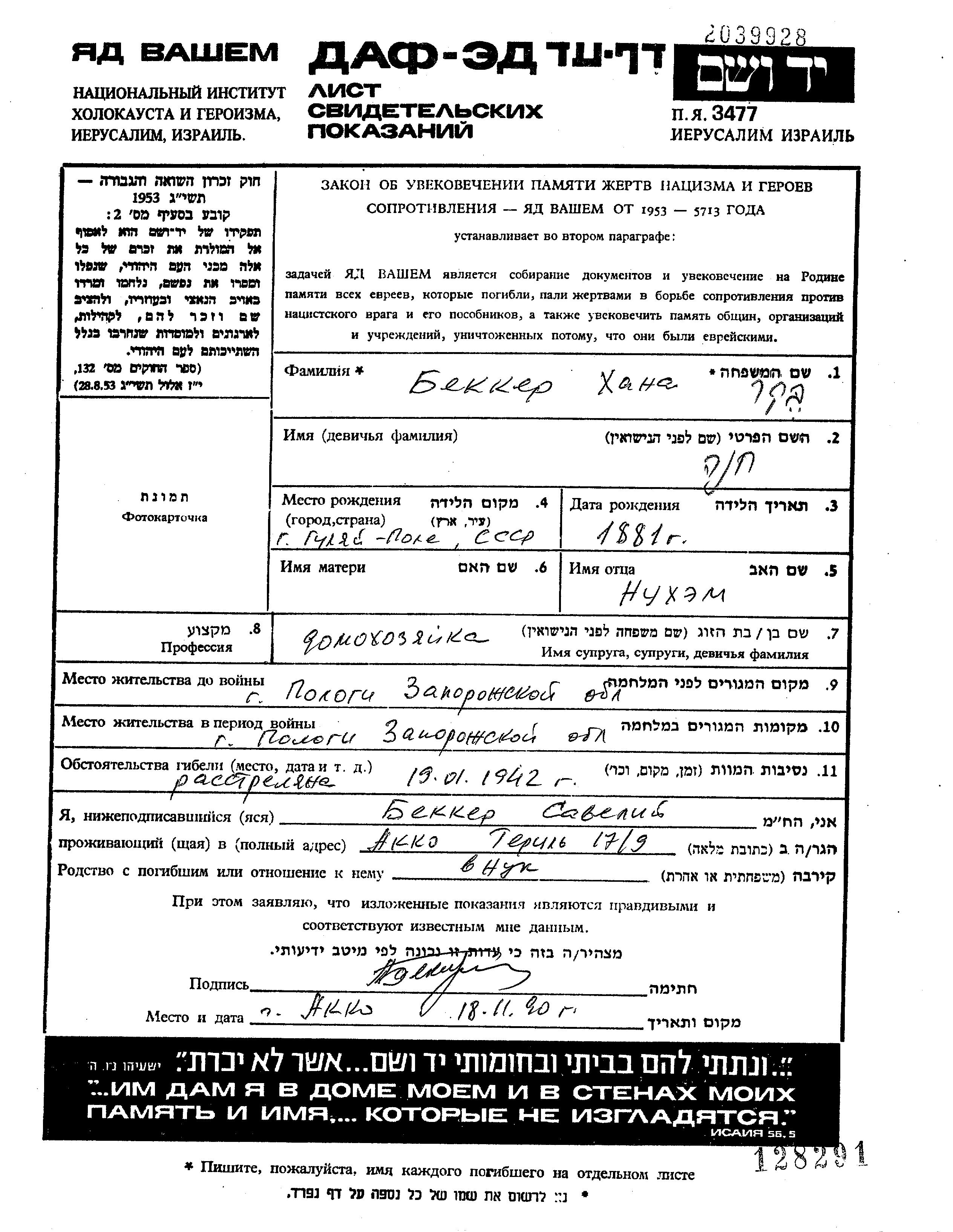 Khana Beker wurde im Jahr 1881 in Gulyay Pole, Ukraine (UdSSR) geboren. Sie war die Tochter von Nukhem. Sie war Hausfrau. Vor dem Zweiten Weltkrieg lebte sie in Pologi, Ukraine (UdSSR). Während des Krieges war sie in Pologi, Ukraine (UdSSR).