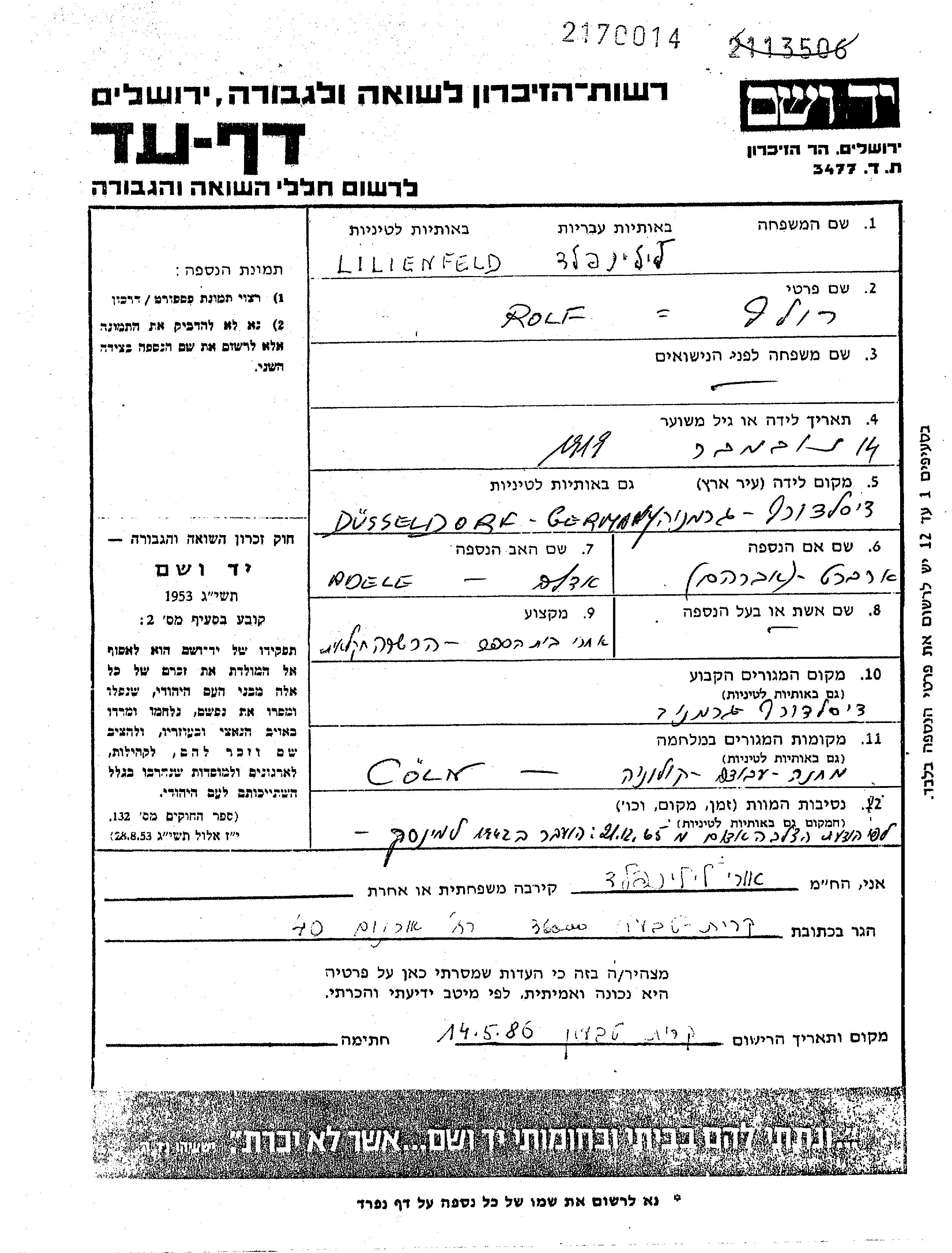 Rolf Lilienfeld wurde im Jahr 1919 in Duesseldorf, Deutsches Reich geboren. Er war der Sohn von Albert Avraham und Adele. Er war Student und Ledig. Vor dem Zweiten Weltkrieg lebte er in Duesseldorf, Deutsches Reich. Während des Krieges war er in Koeln, Deutsches Reich.