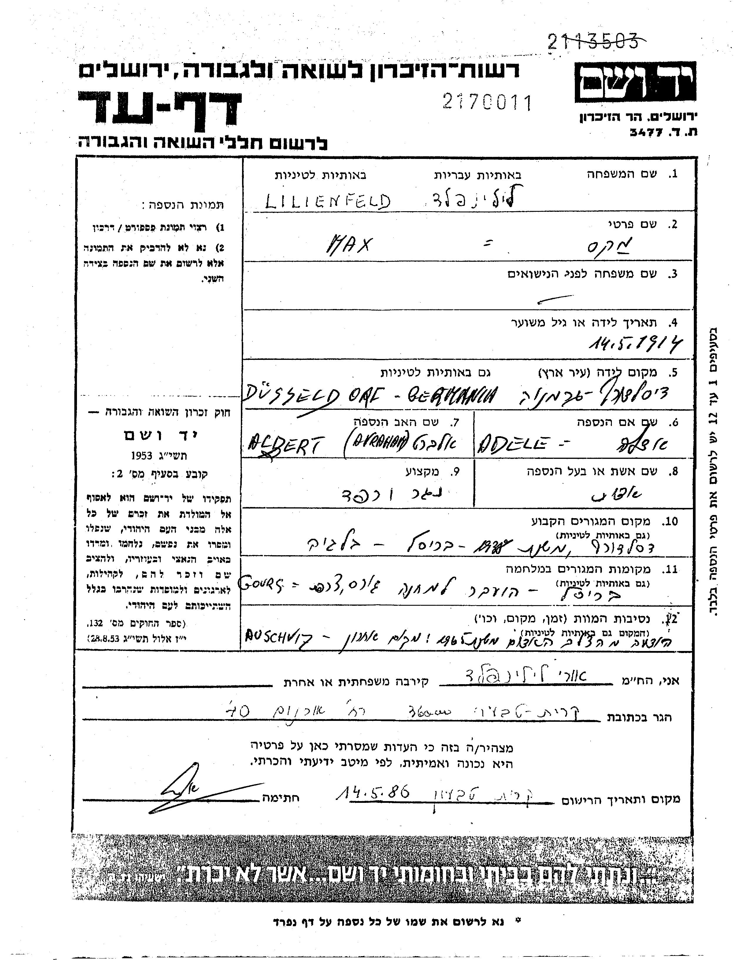 Max Lilienfeld wurde im Jahr 1914 in Duesseldorf, Deutsches Reich geboren. Er war der Sohn von Albert Avraham und Adele. Er war Zimmermann und mit Edit Verheiratet. Vor dem Zweiten Weltkrieg lebte er in Duesseldorf, Deutsches Reich. Während des Krieges war er in Bruxelles, Belgien.