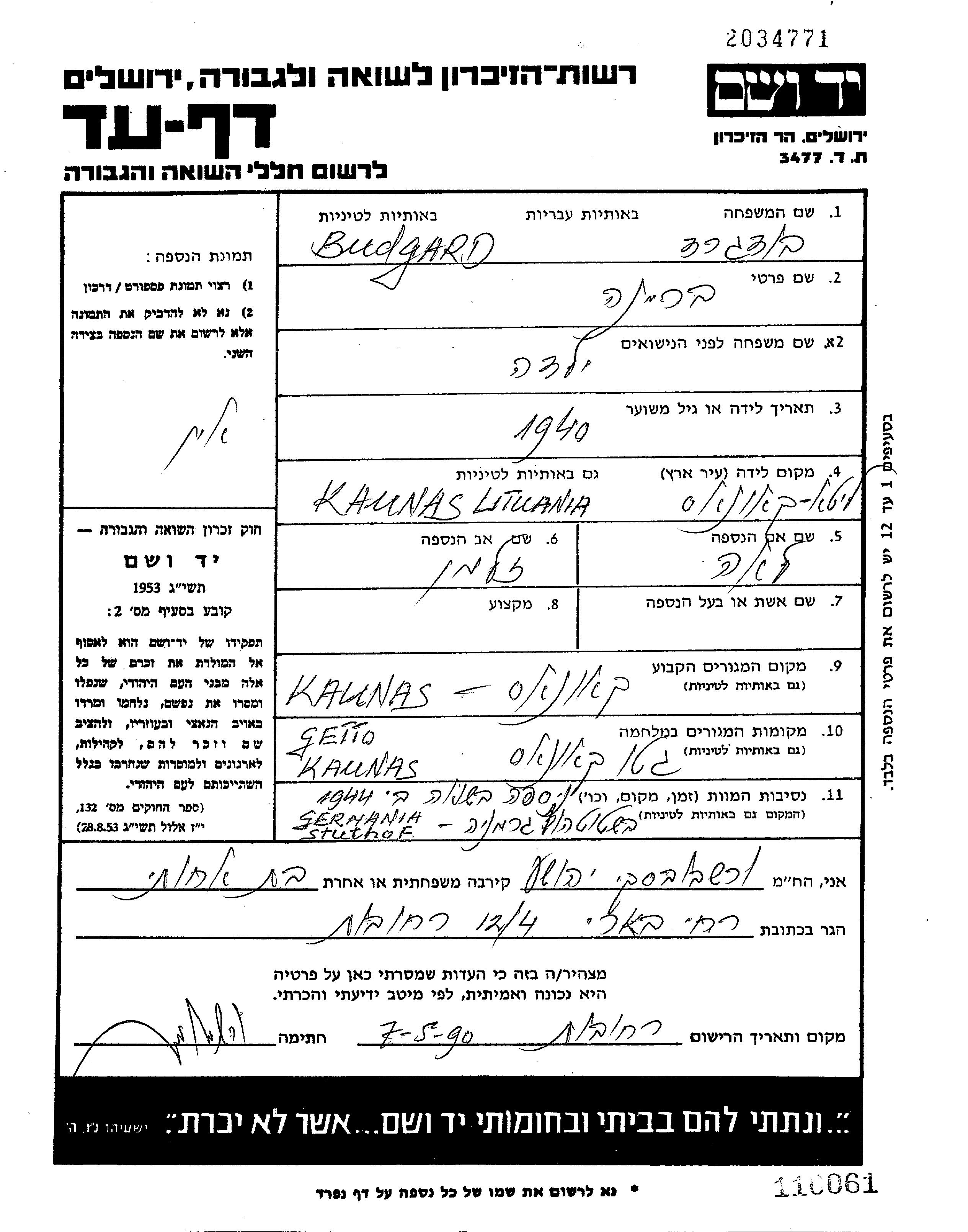 Braina Budgard wurde im Jahr 1940 in Kaunas, Litauen geboren. Sie war die Tochter von Zalman und Lea, geb. Versvovski. Sie war Kind. Vor dem Zweiten Weltkrieg lebte sie in Kaunas, Litauen. Während des Krieges war sie in Kaunas, Litauen.