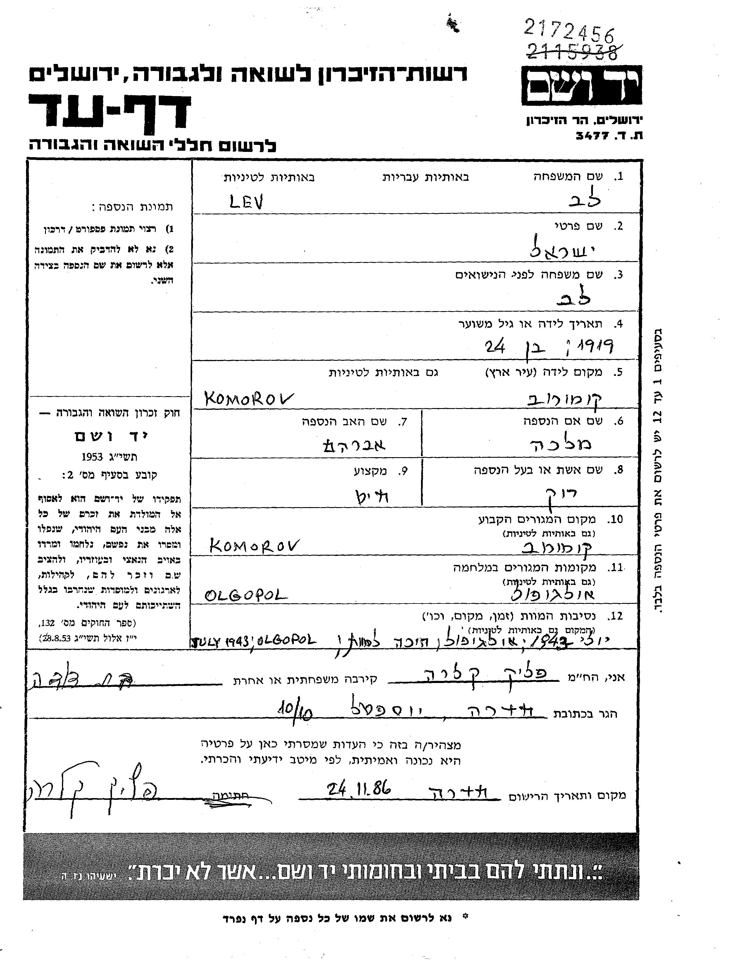 Israel Lev wurde im Jahr 1919 in Komorow, Polen geboren. Er war der Sohn von Avraham und Malka, geb. Staif. Er war Schneider und Ledig. Vor dem Zweiten Weltkrieg lebte er in Komorow, Polen. Während des Krieges war er in Olgopol, Ukraine (UdSSR).