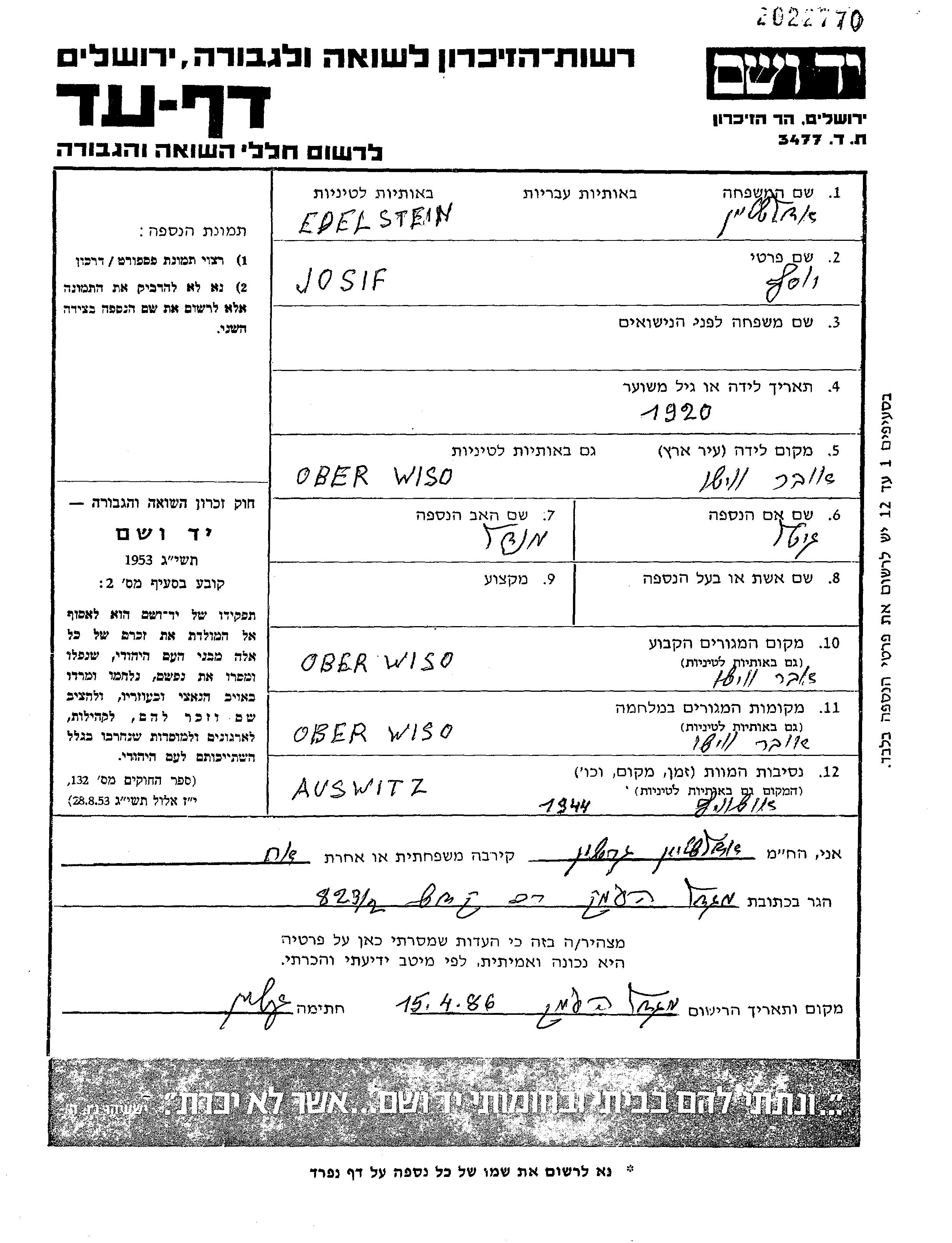 Josif Edelstein wurde im Jahr 1920 in Ober Wischo, Rumänien geboren. Er war der Sohn von Mendel und Gitl. Vor dem Zweiten Weltkrieg lebte er in Ober Wischo, Rumänien. Während des Krieges war er in Ober Wischo, Rumänien.