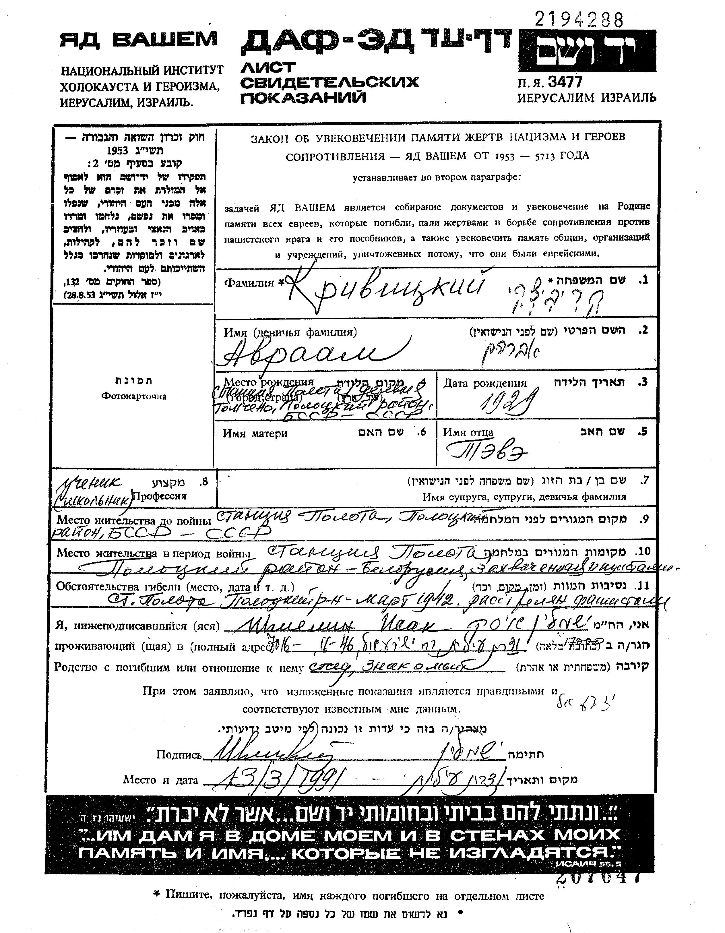 Kriwicki Avraam 1929 Polota, Weißrussland (UdSSR) Gedenkblatt