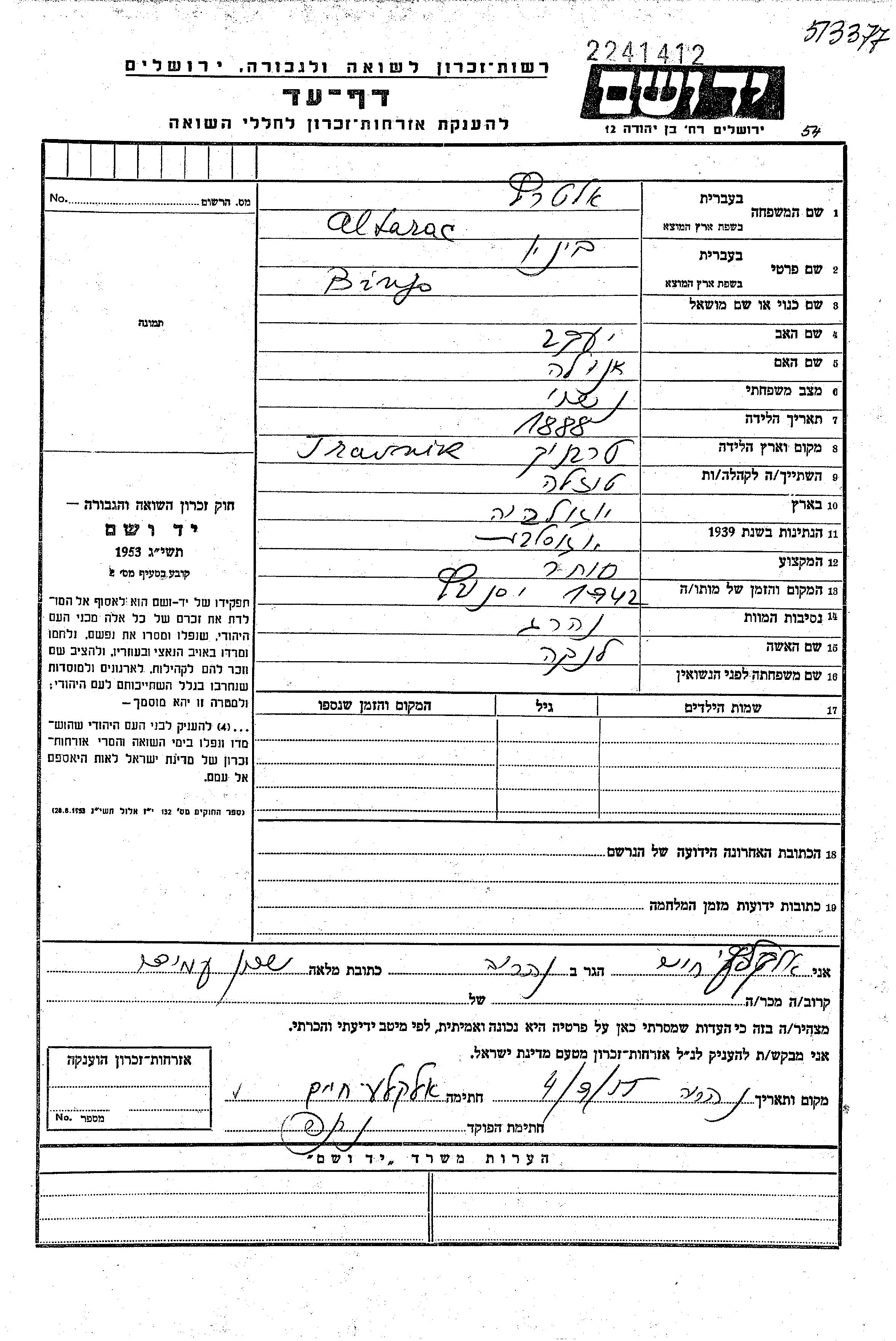 Binjo Bina Altarac wurde im Jahr 1888 in Travnik, Jugoslawien geboren. Er war der Sohn von Yakov und Ana. Er war Kaufmann/-frau und mit Lenka Verheiratet. Vor dem Zweiten Weltkrieg lebte er in Jugoslawien. Während des Krieges war er in Jugoslawien.