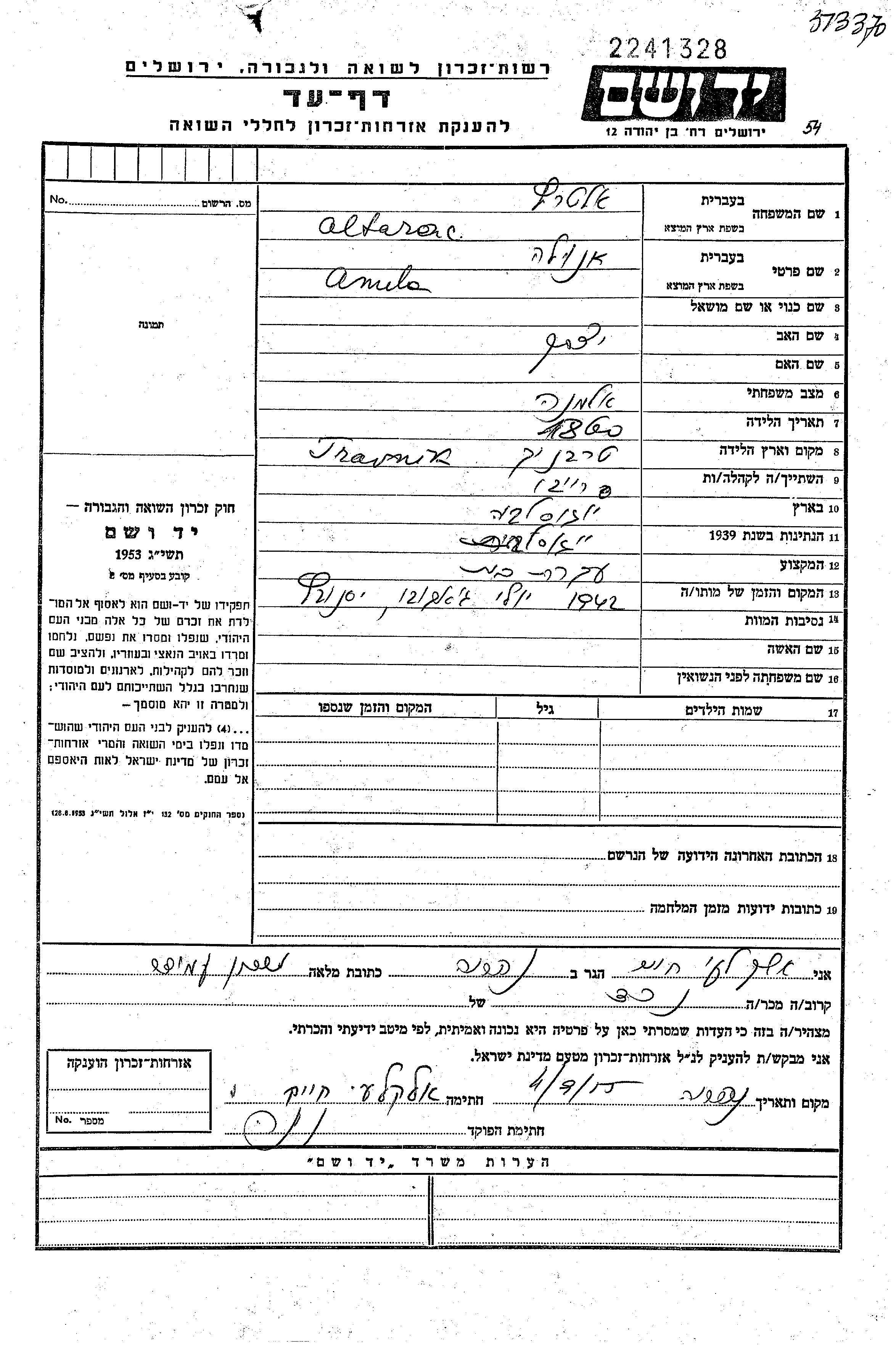 Anula Altarac wurde im Jahr 1860 in Travnik, Jugoslawien geboren. Sie war die Tochter von Yitzkhak. Sie war Hausfrau und mit Yakov Verwitwet. Vor dem Zweiten Weltkrieg lebte sie in Travnik, Jugoslawien. Während des Krieges war sie in Jugoslawien.