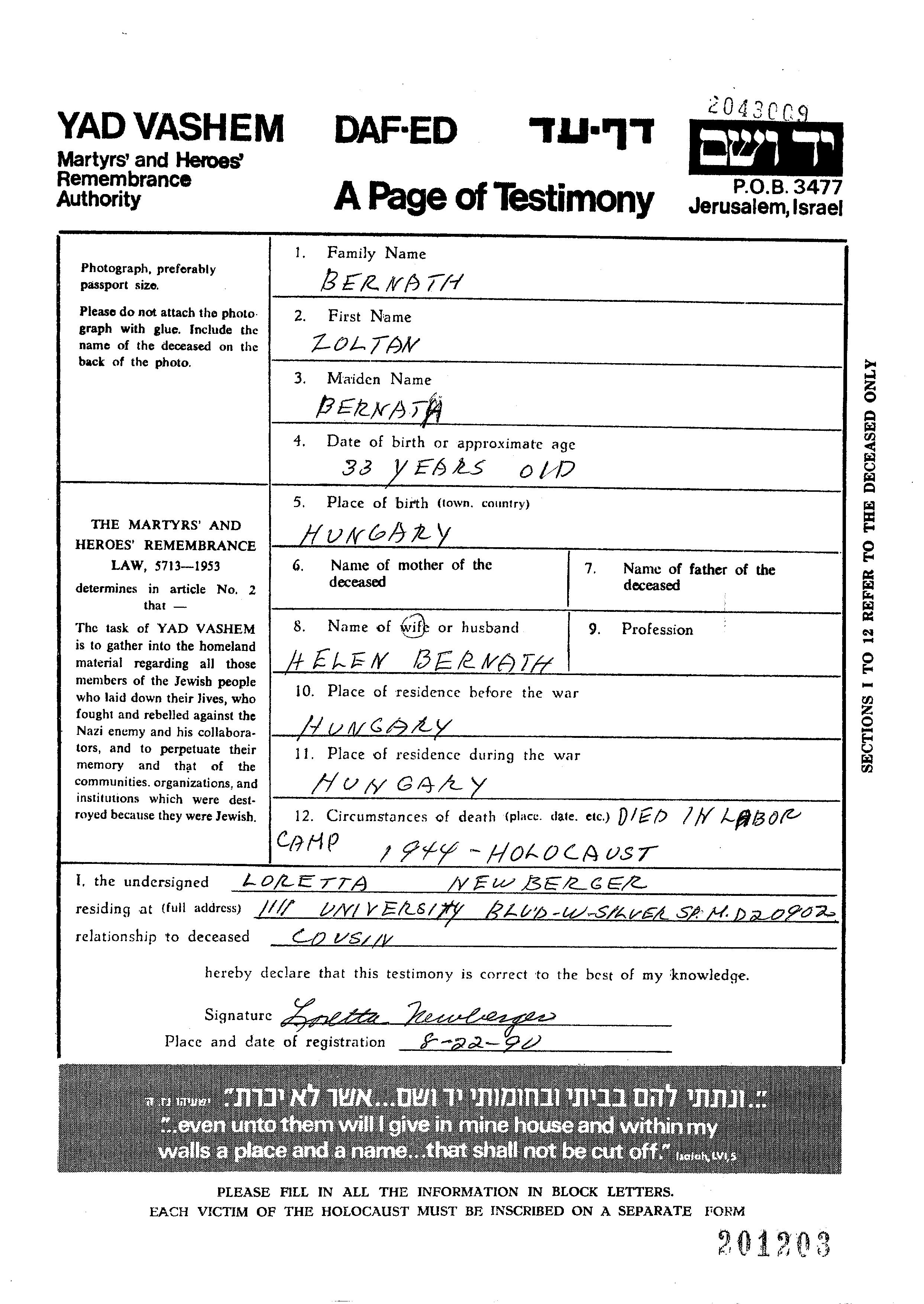 Zoltan Bernath wurde im Jahr 1911 in Ungarn geboren. Er war mit Helen Verheiratet. Vor dem Zweiten Weltkrieg lebte er in Ungarn. Während des Krieges war er in Ungarn.