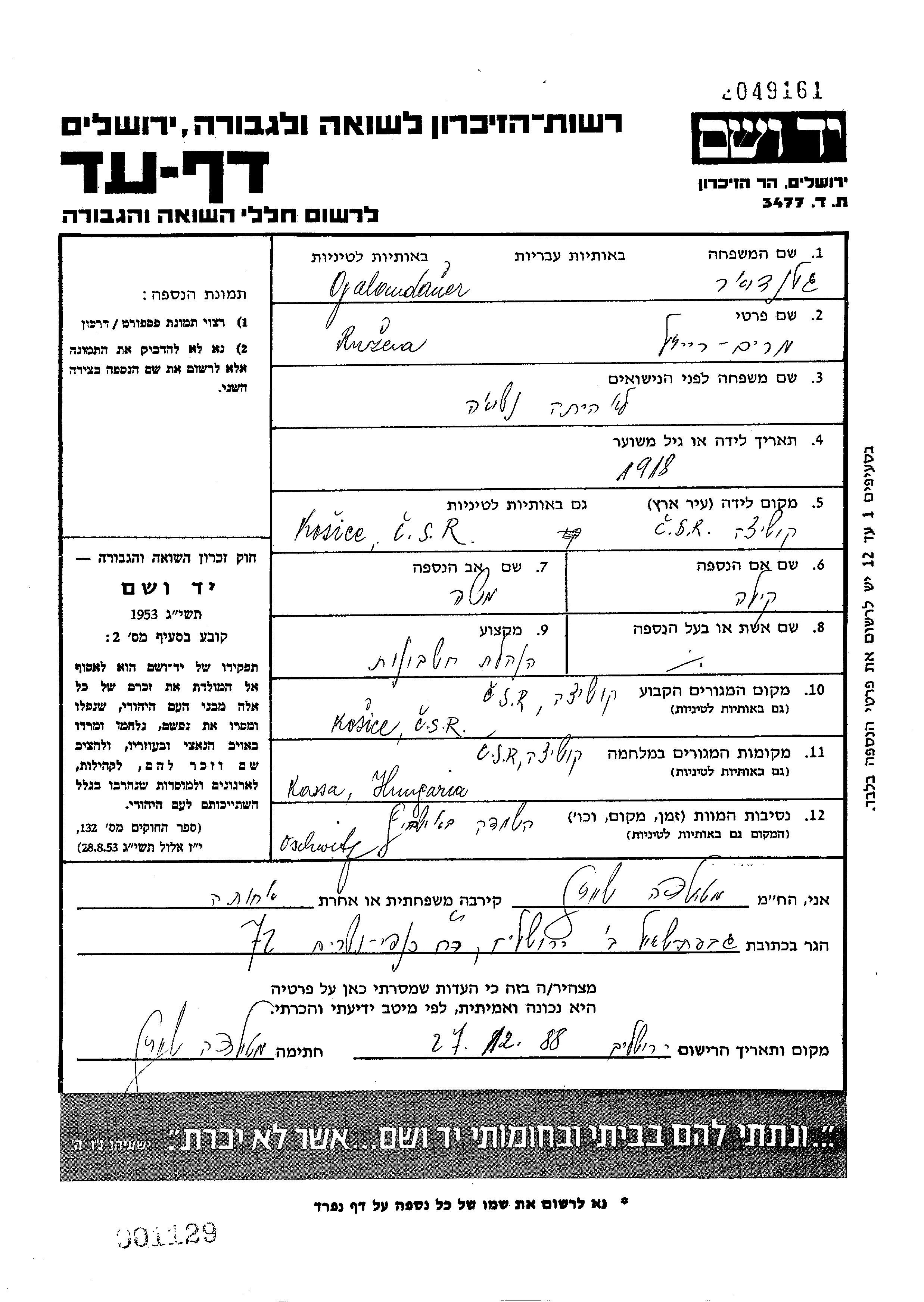 Ruzena Miriam Rosanna Galandauer wurde im Jahr 1918 in Kosice, Tschechoslowakei geboren. Sie war die Tochter von Mosche und Keila Karolina, geb. Grün. Sie war Buchhalter/-in und Ledig. Vor dem Zweiten Weltkrieg lebte sie in Kosice, Tschechoslowakei. Während des Krieges war sie in Kassa, Tschechoslowakei.