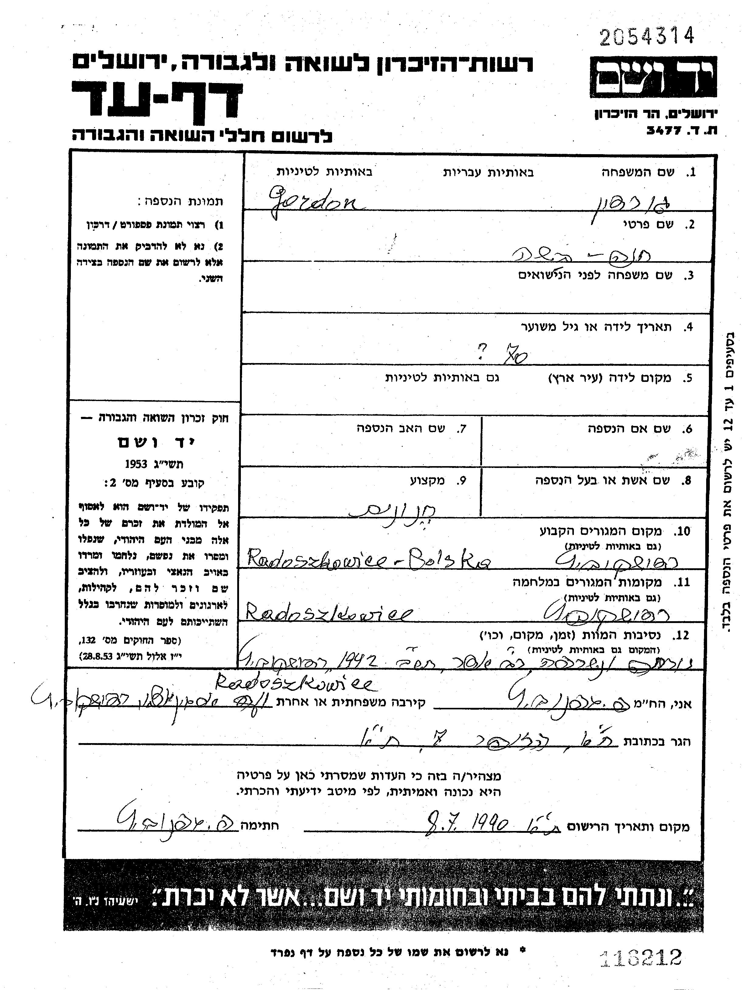 Basha Khana Gordon. Sie war Besitzer/-in eines lebensmittelgeschäfts. Vor dem Zweiten Weltkrieg lebte sie in Radoszkowicze, Polen. Während des Krieges war sie in Radoszkowicze, Polen.