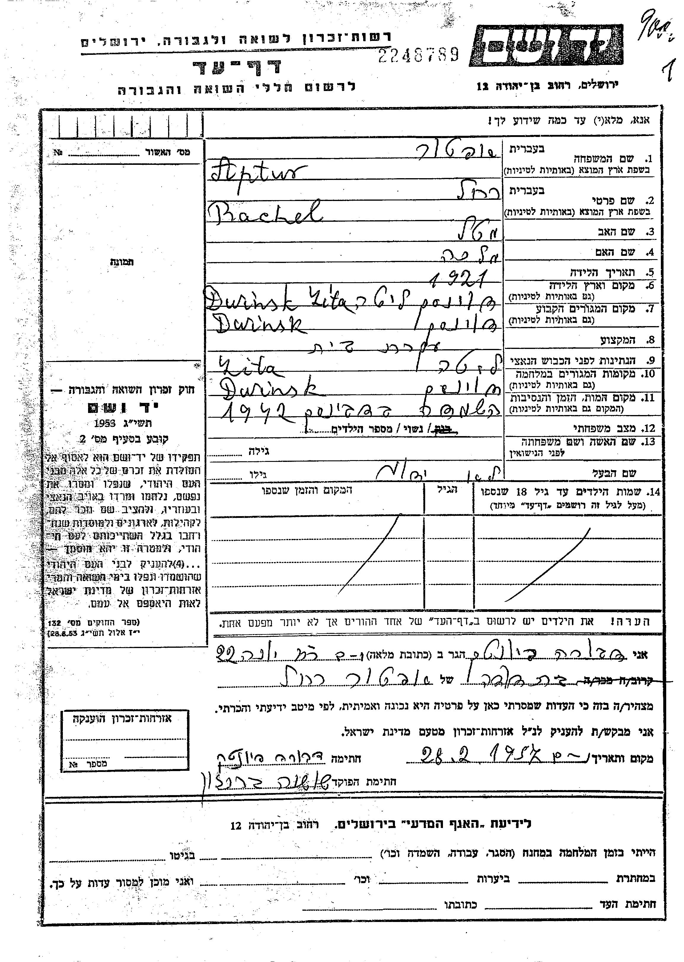 Rachel Aptur wurde im Jahr 1921 in Dvinsk, Lettland geboren. Sie war die Tochter von Motel und Malka, geb. Dvoretz. Sie war Hausfrau und Verheiratet. Vor dem Zweiten Weltkrieg lebte sie in Dvinsk, Lettland. Während des Krieges war sie in Dvinsk, Lettland.