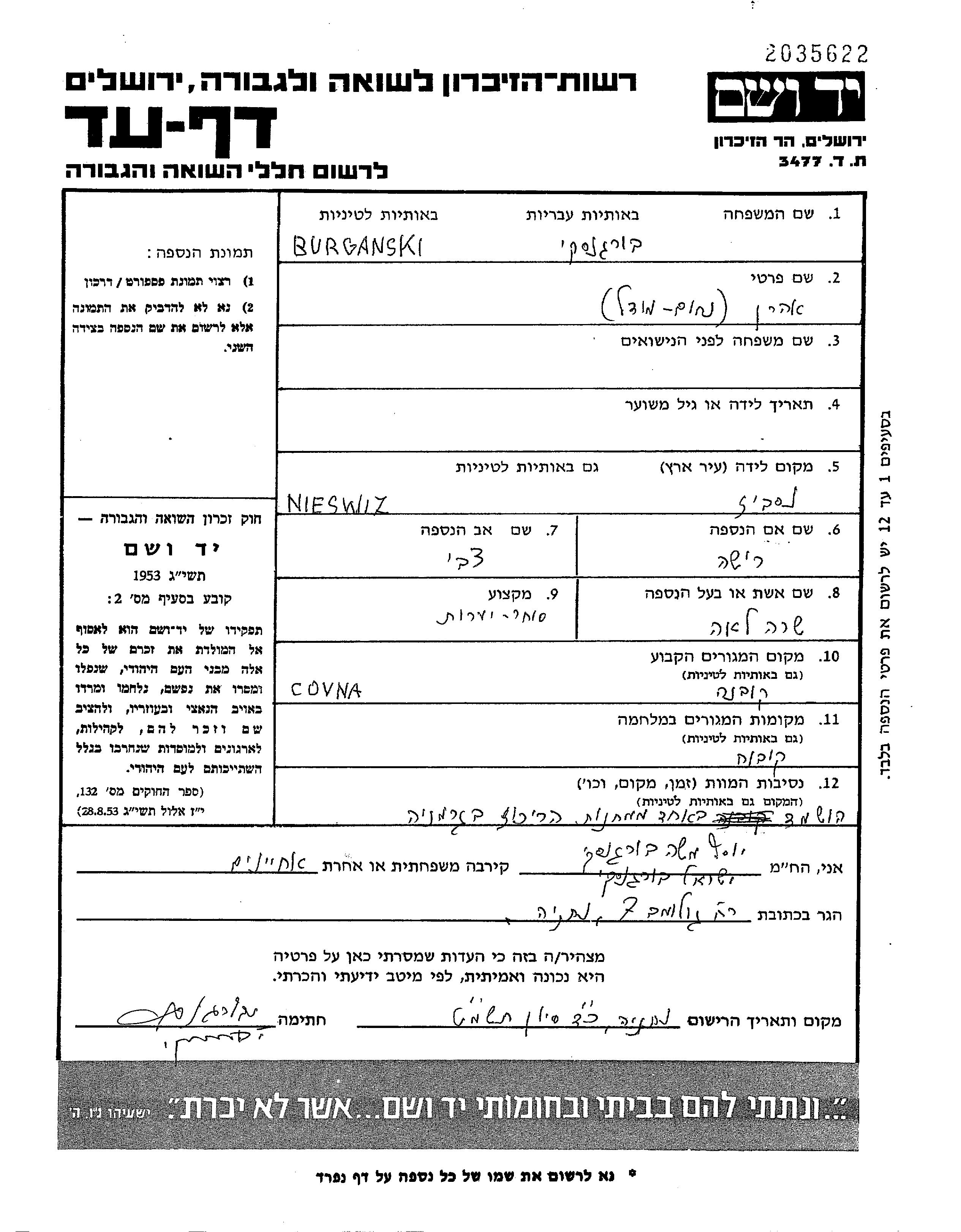 Mendel Aharon Nakhum Burganski wurde in Nieśwież, Polen geboren. Er war der Sohn von Tzvi und Risha. Er war Kaufmann/-frau und mit Sara Lea Verheiratet. Vor dem Zweiten Weltkrieg lebte er in Kowno, Litauen.