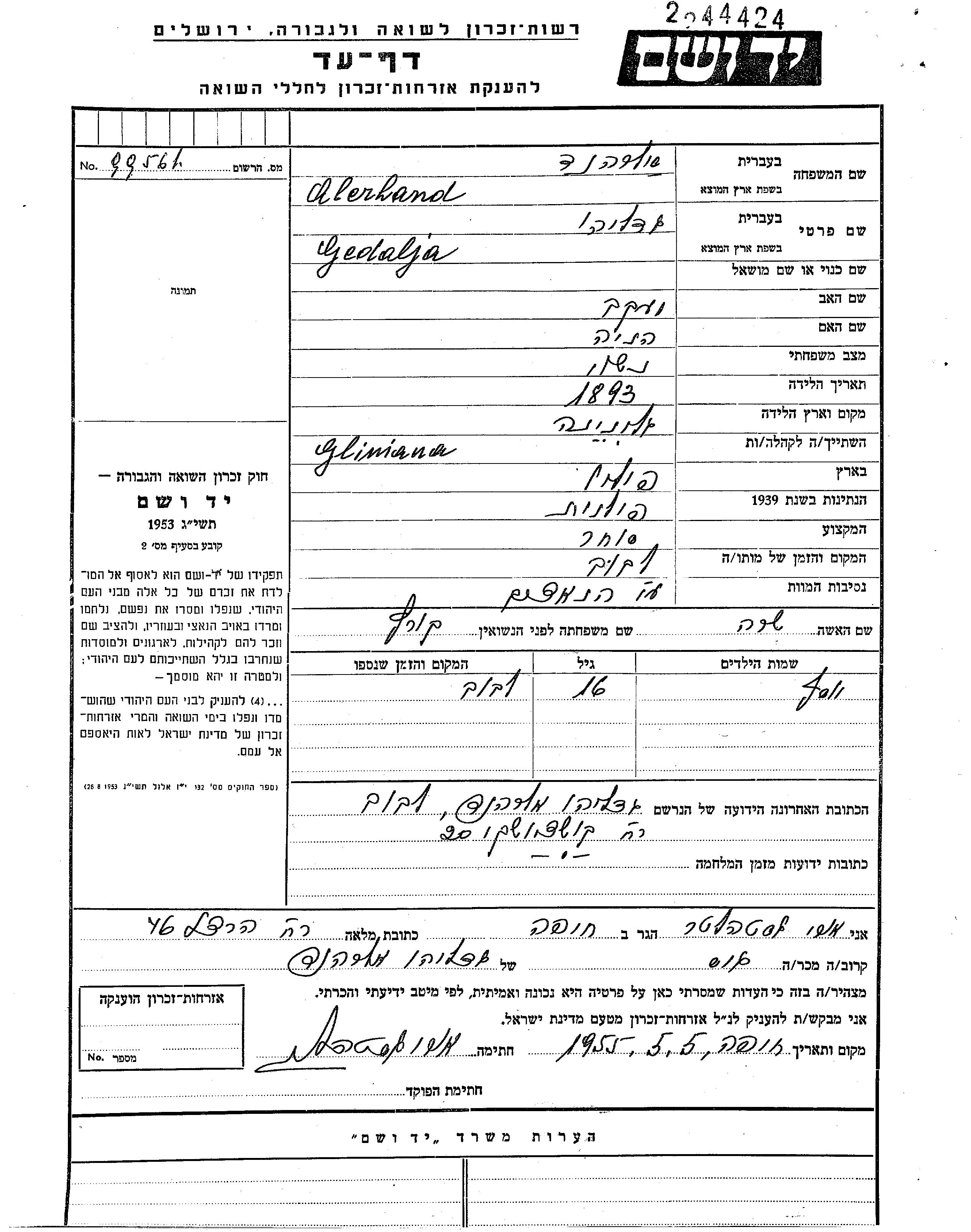 Gedalja Alerhand wurde im Jahr 1893 in Gliniany, Poland geboren. Er war der Sohn von Yakov und Henia. Er war Kaufmann/-frau und mit Sara Verheiratet. Vor dem Zweiten Weltkrieg lebte er in Gliniany, Poland. Während des Krieges war er in Lwow, Polen.