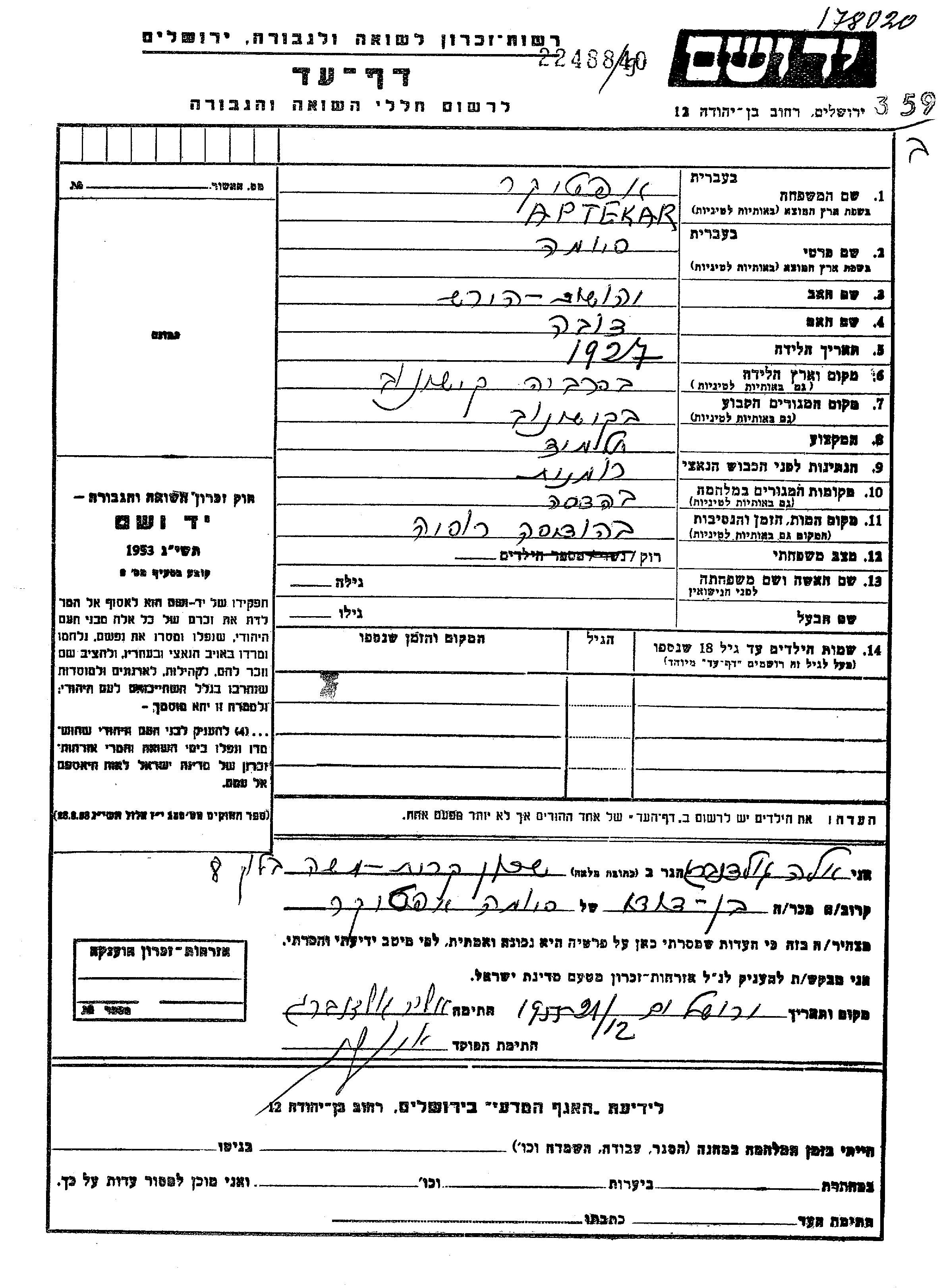 Sioma Aptekar wurde im Jahr 1927 in Tighina, Rumänien geboren. Er war der Sohn von Shmuel und Rivka. Er war Angestellte/-r und mit Rochl Verheiratet. Vor dem Zweiten Weltkrieg lebte er in Tighina, Rumänien. Während des Krieges war er in Tighina, Rumänien.