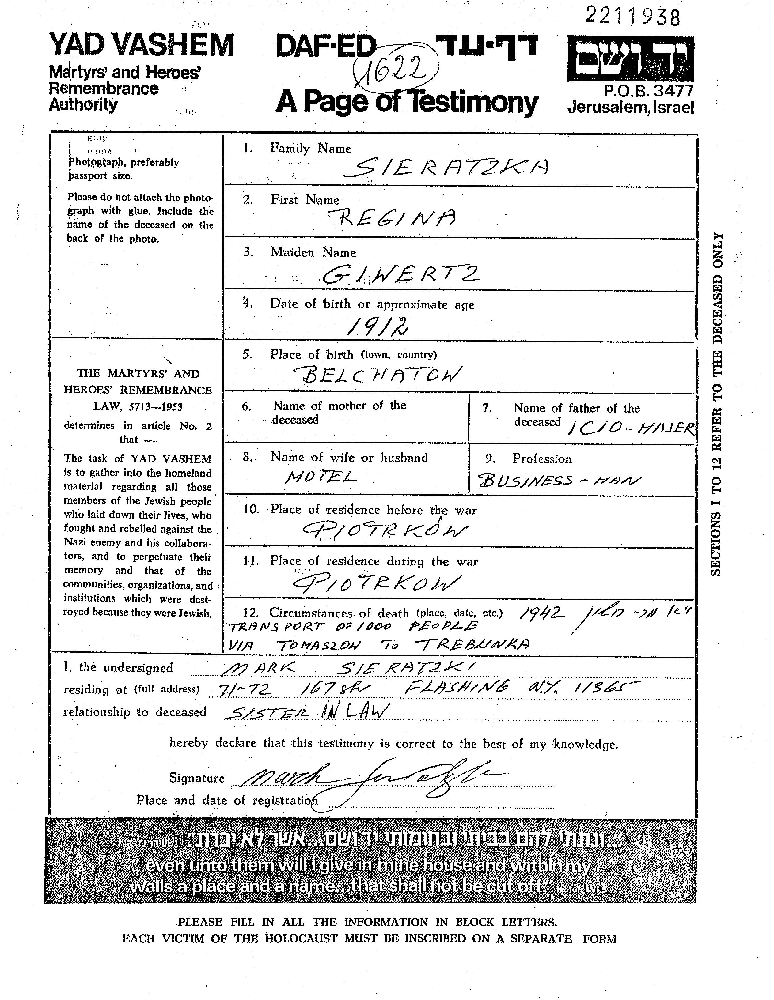 Regina Sieratzka, geb. Giwertz wurde im Jahr 1912 in Bełchatów, Polen geboren. Sie war die Tochter von Icio Majer. Sie war Kaufmann/-frau und mit Motel Verheiratet. Vor dem Zweiten Weltkrieg lebte sie in Piotrkow Trybunalski, Polen. Während des Krieges war sie in Piotrkow Trybunalski, Polen.