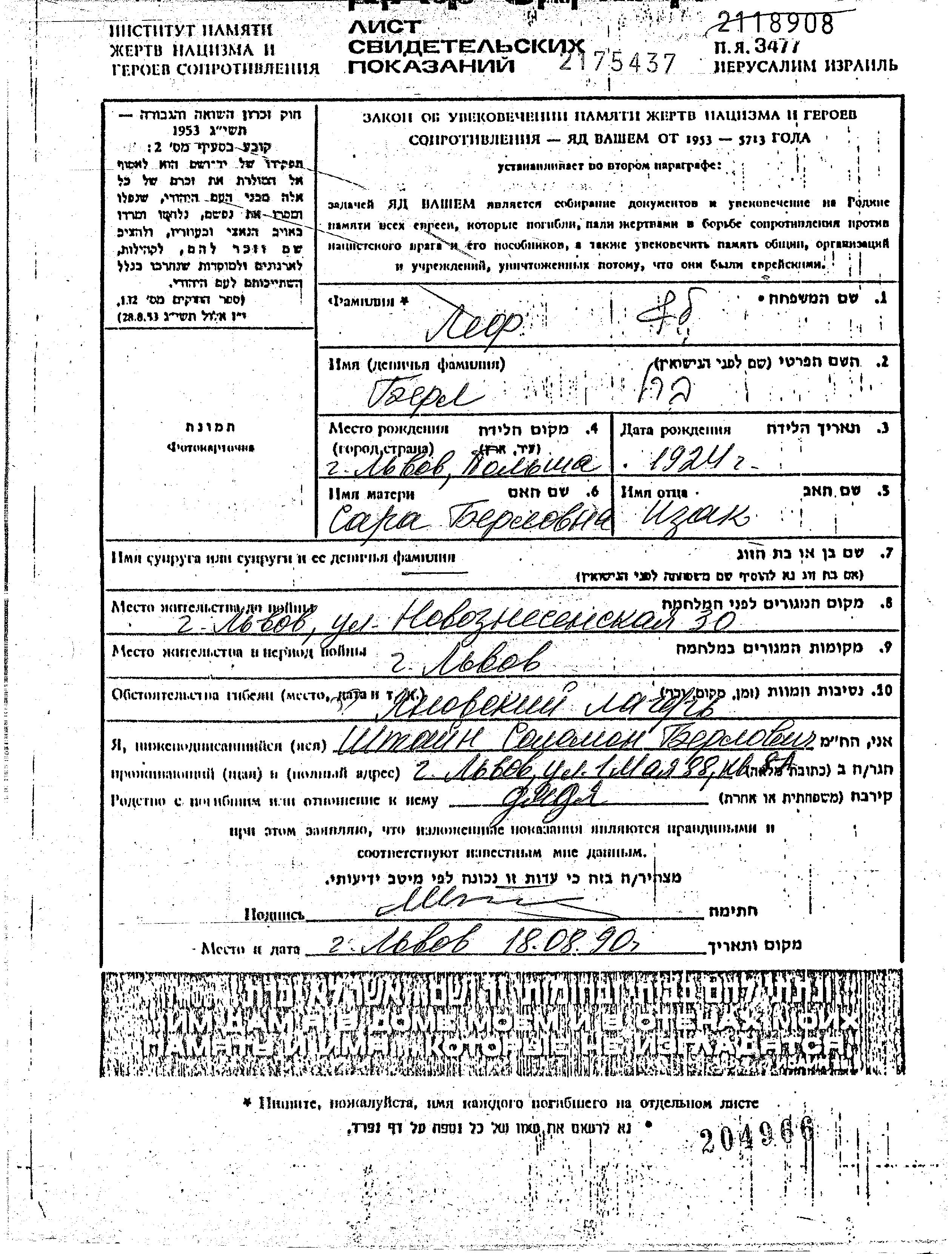 Berl Lef wurde im Jahr 1924 in Lwow, Polen geboren. Er war der Sohn von Izak und Sara, geb. Shtain. Vor dem Zweiten Weltkrieg lebte er in Lwow, Polen. Während des Krieges war er in Lwow, Polen.