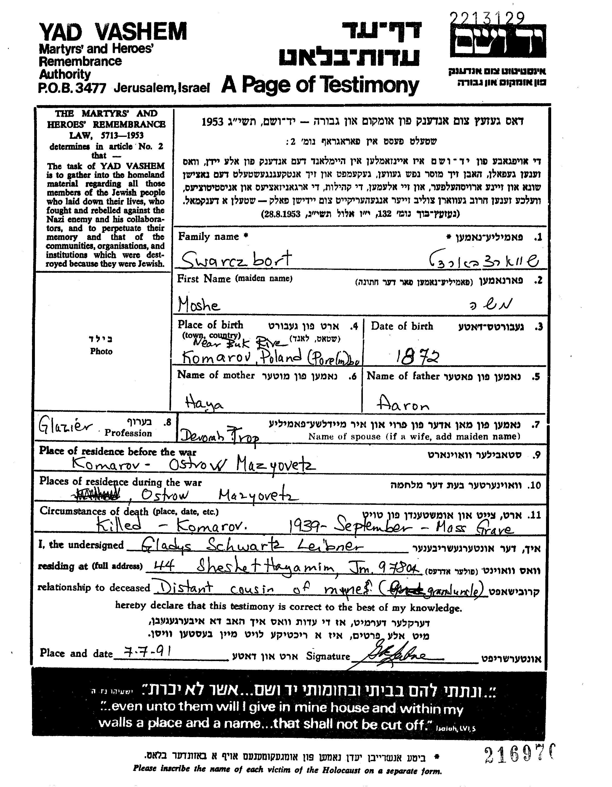 Moshe Swarczbort Shvartzbart wurde im Jahr 1872 in Komorowo, Polen geboren. Er war der Sohn von Aaron und Haya. Er war Glaser/-in und mit Devorah Verheiratet. Vor dem Zweiten Weltkrieg lebte er in Komorowo, Polen. Während des Krieges war er in Ostrów Mazowiecka, Polen.