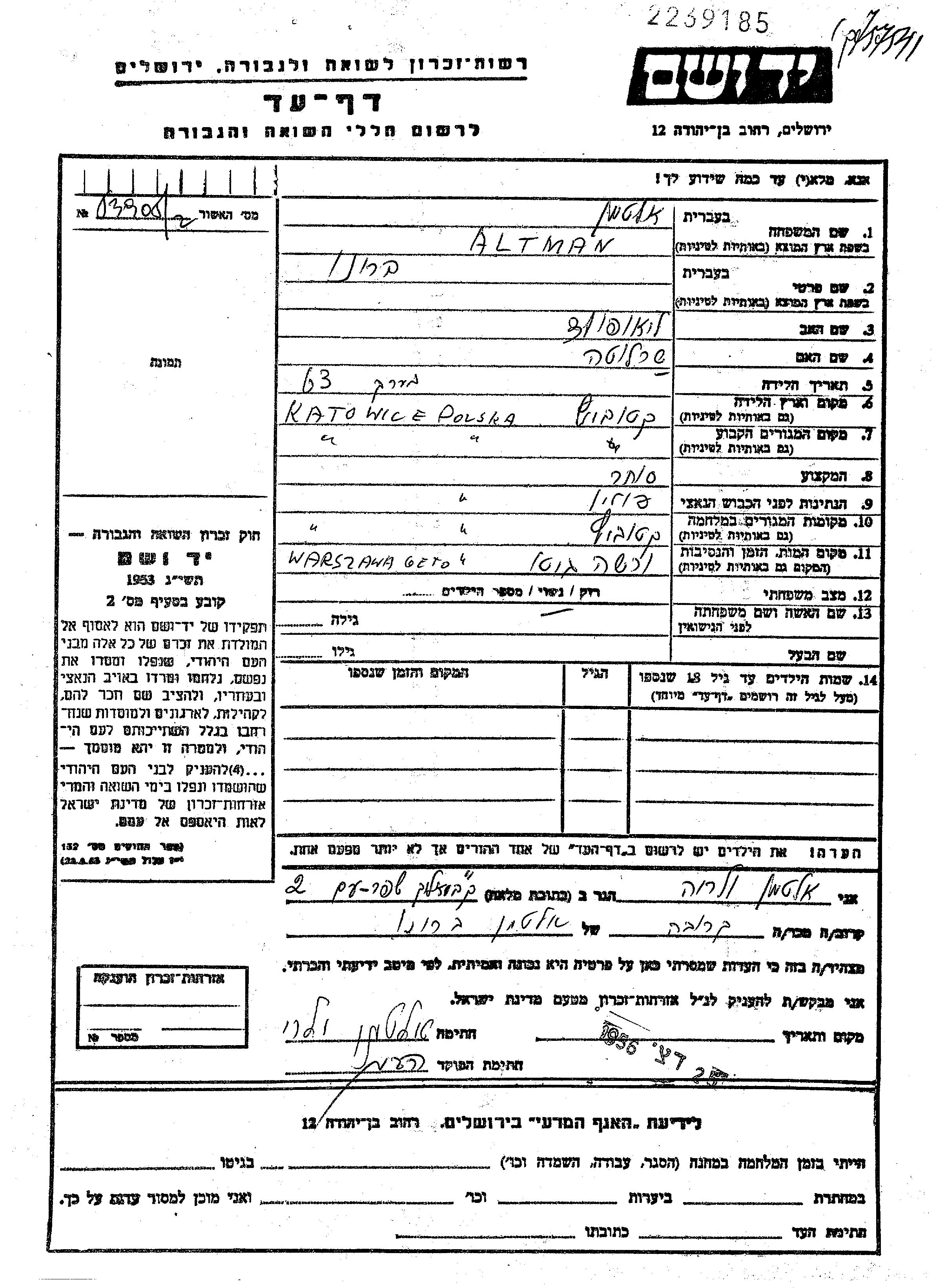 Bruno Altman wurde in Katowice, Polen geboren. Er war der Sohn von Leopold und Sharlota. Er war Kaufmann/-frau und Verheiratet. Vor dem Zweiten Weltkrieg lebte er in Katowice, Polen. Während des Krieges war er in Katowice, Polen.
