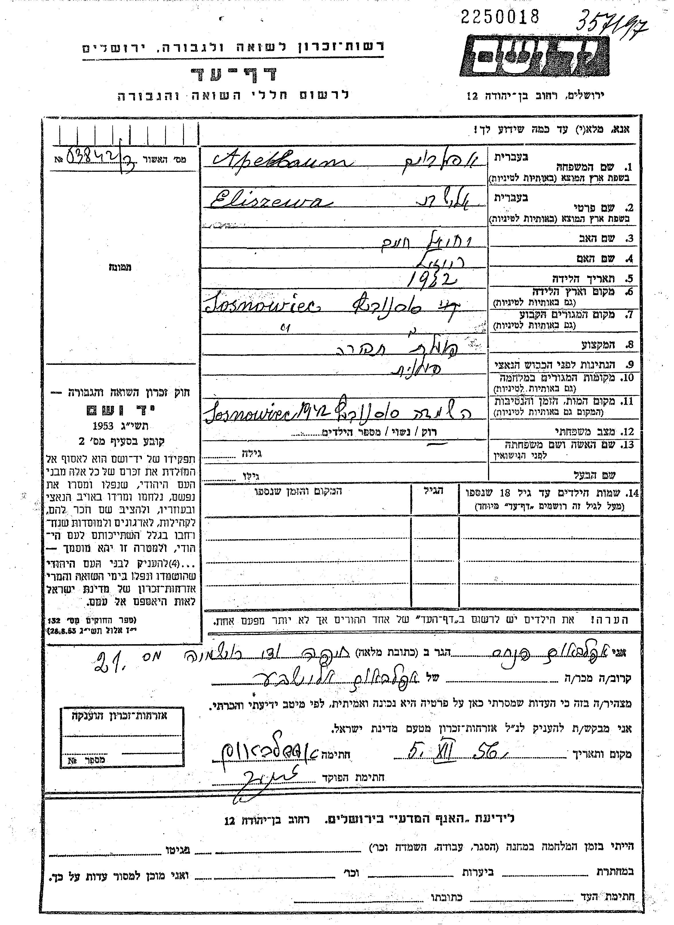 Eliszewa Apelbaum wurde im Jahr 1922 in Sosnowiec, Polen geboren. Sie war die Tochter von Ichyel Chaim und Rajzel, geb. Skorka. Sie war Schneiderin und Ledig. Vor dem Zweiten Weltkrieg lebte sie in Sosnowiec, Polen. Während des Krieges war sie in Polen.