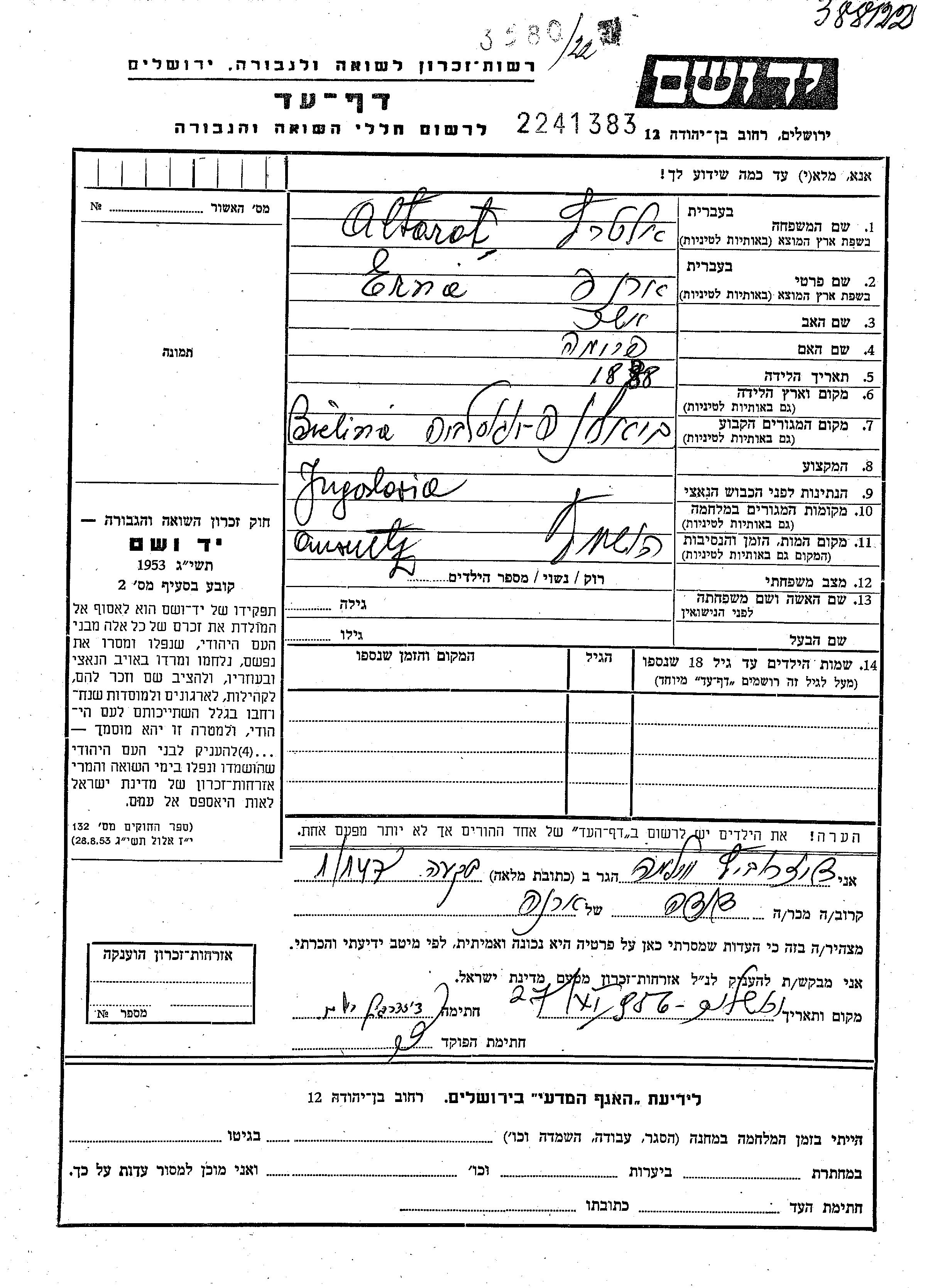 Erna Altarat, geb. Gaon wurde im Jahr 1888 in Bijeljina, Jugoslawien geboren. Sie war die Tochter von Asher und Fruma. Vor dem Zweiten Weltkrieg lebte sie in Jugoslawien.