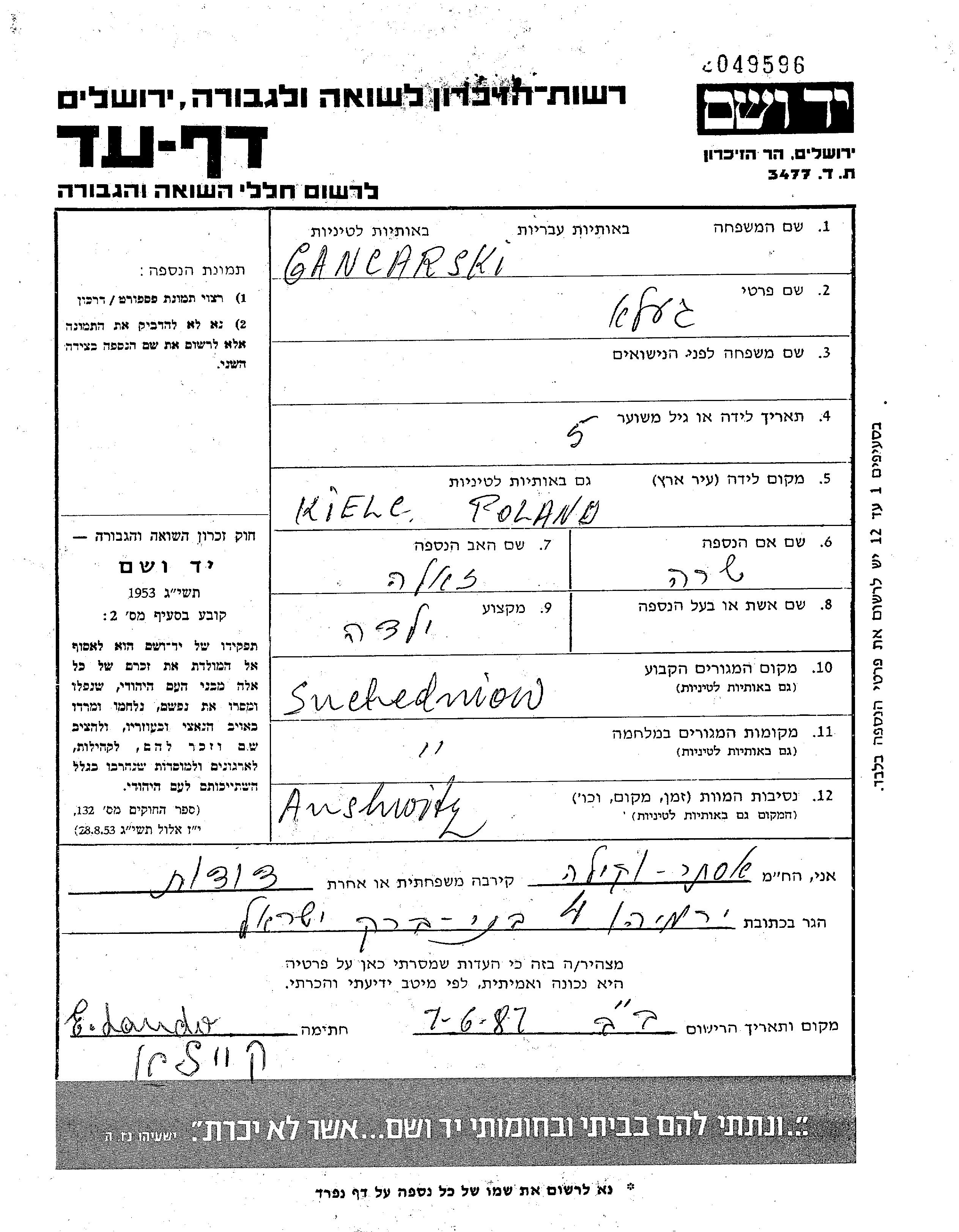 Gela Gancarski wurde in Kielce, Polen geboren. Sie war die Tochter von Zala Zala und Sara. Sie war Kind. Vor dem Zweiten Weltkrieg lebte sie in Suchedniow, Polen. Während des Krieges war sie in Suchedniow, Polen.
