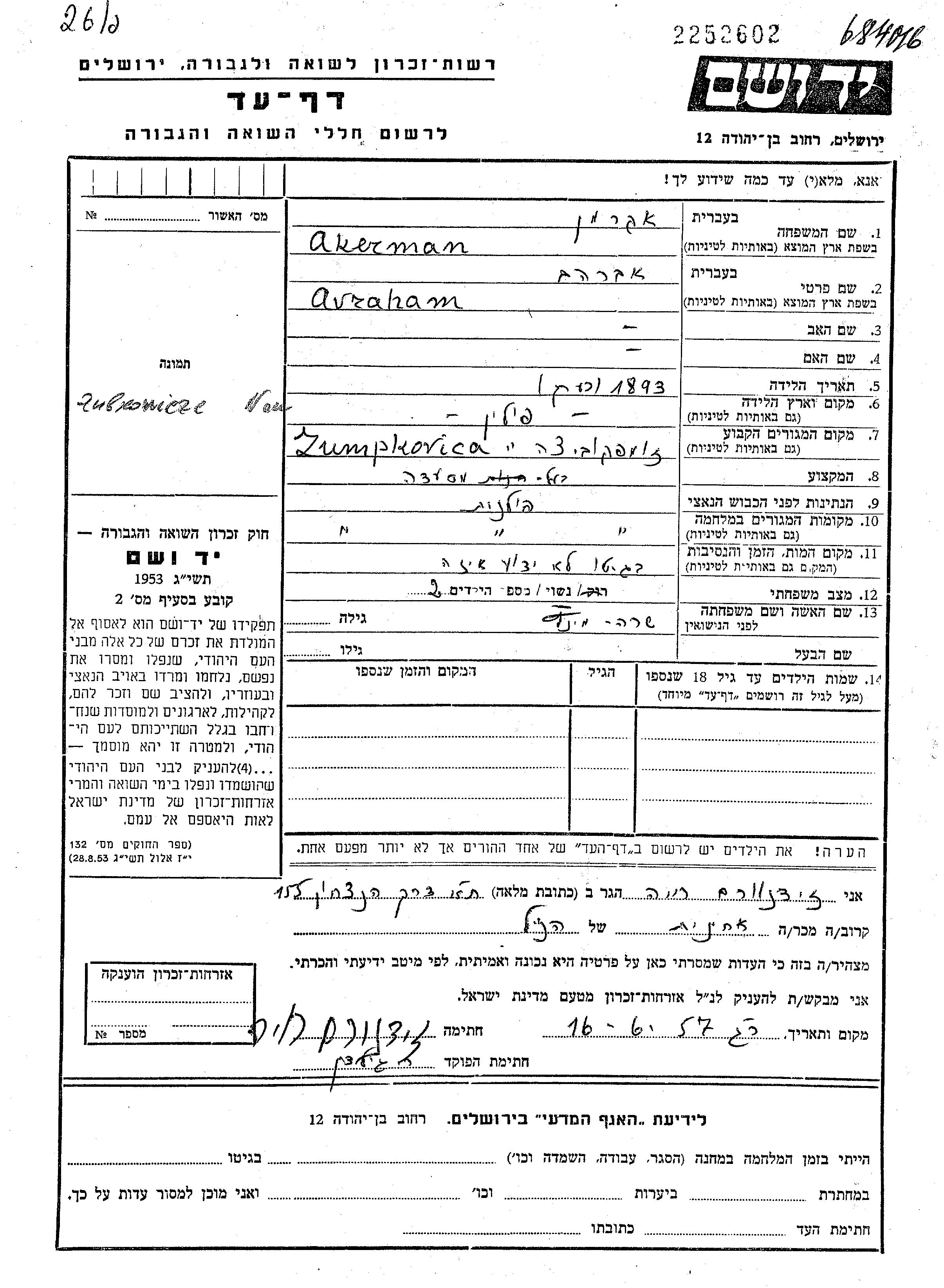 Avraham Akerman wurde im Jahr 1893 in Polen geboren. Er war Restaurantbesitzer/-in und mit Sara Verheiratet. Vor dem Zweiten Weltkrieg lebte er in Zompkovica, Polen. Während des Krieges war er in Zompkovica, Polen.