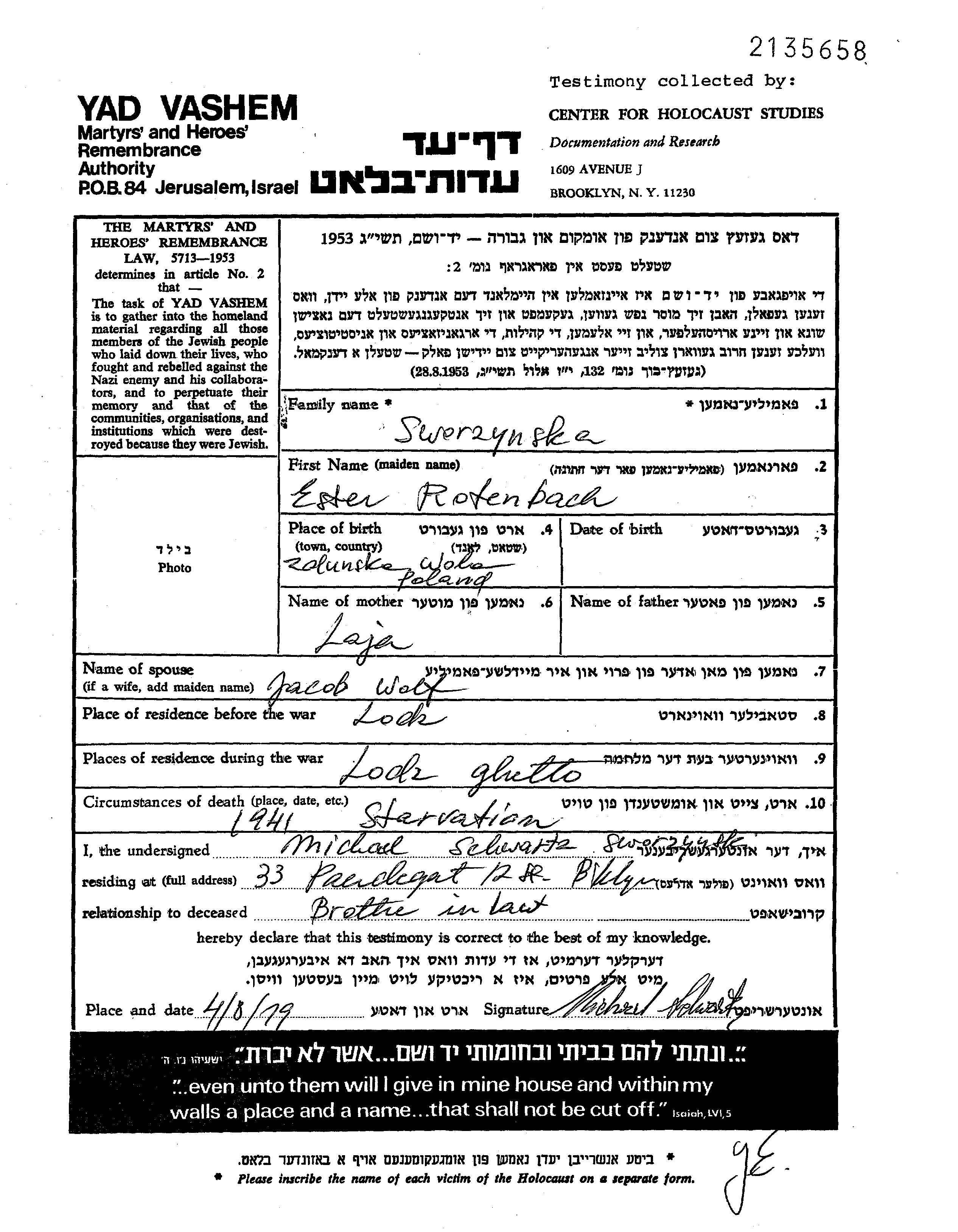 Ester Sworzynski, geb. Rotenbach wurde in Zdunska Wola, Polen geboren. Sie war die Tochter von Laja. Sie war mit Jacob Wolf Verheiratet. Vor dem Zweiten Weltkrieg lebte sie in Lodz, Polen. Während des Krieges war sie in Lodz, Polen.