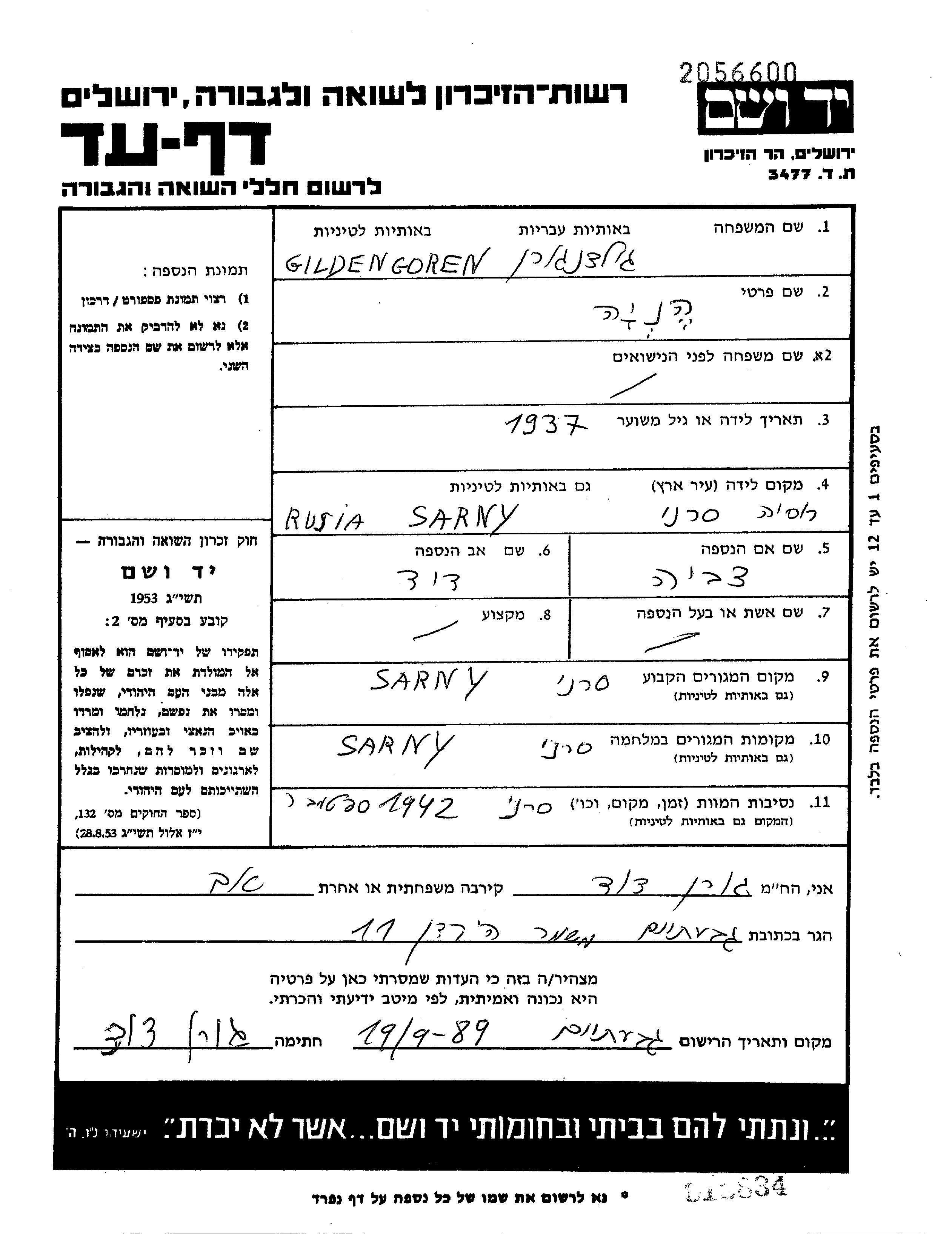 Henia Gildengoren wurde im Jahr 1937 in Sarny, Polen geboren. Sie war die Tochter von David und Tzvia, geb. Okoszko. Sie war Kind. Vor dem Zweiten Weltkrieg lebte sie in Sarny, Polen. Während des Krieges war sie in Sarny, Polen.