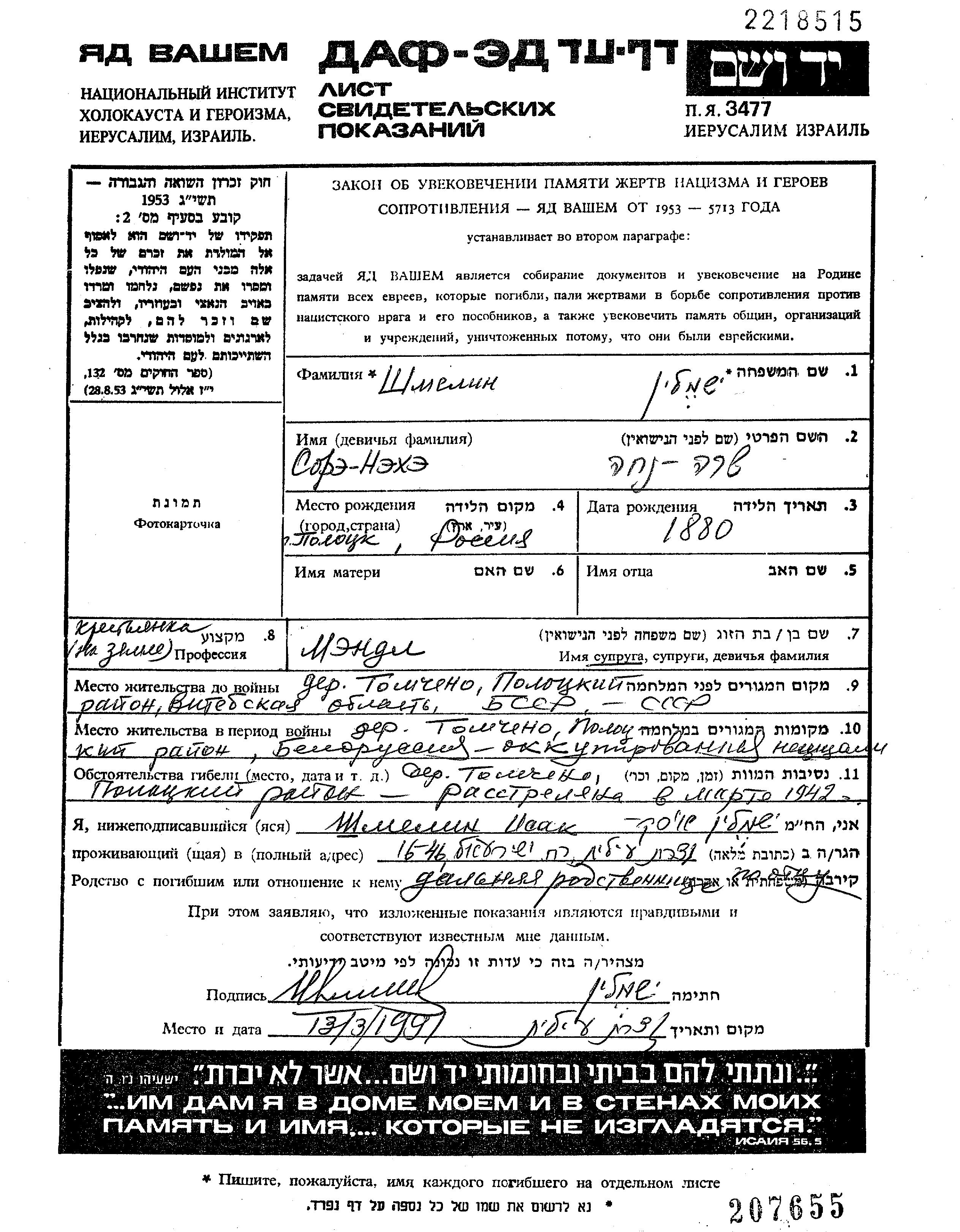 Sore Nekhe Shmelin Shmeilin wurde in Polotsk, Weißrussland (UdSSR) geboren. Sie war Landwirt und mit Mendl Verheiratet. Vor dem Zweiten Weltkrieg lebte sie in Tomchino, Weißrussland (UdSSR). Während des Krieges war sie in Tomchino, Weißrussland (UdSSR).