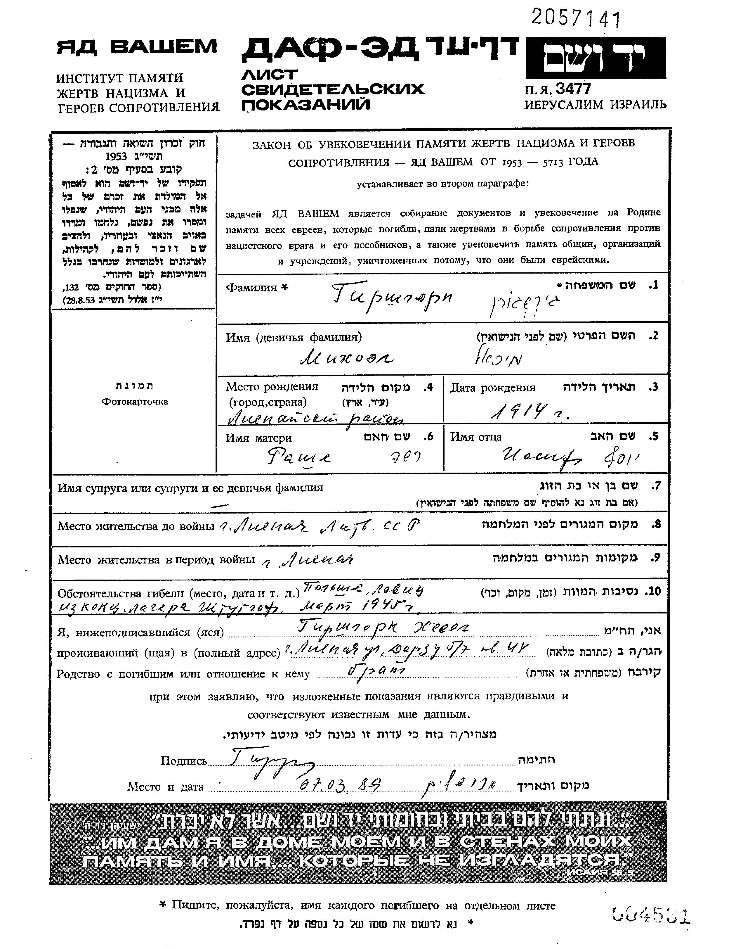 Mikhoel Girshgorn wurde im Jahr 1914 in Lettland geboren. Er war der Sohn von Iosif und Rashe, geb. Hertzberg. Vor dem Zweiten Weltkrieg lebte er in Liepaja, Lettland. Während des Krieges war er in Liepaja, Lettland.