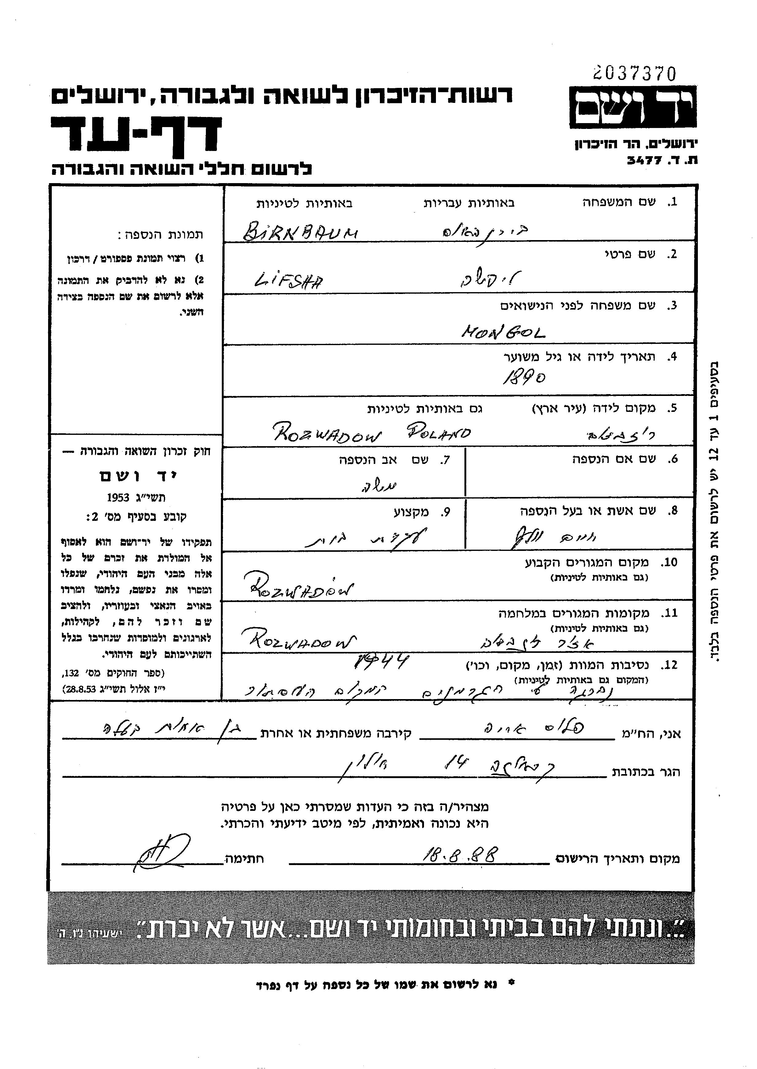 Lifsha Birnbaum, geb. Mongol wurde im Jahr 1890 in Rozwadów, Polen geboren. Sie war die Tochter von Moshe. Sie war Hausfrau und mit Chaim Wolf Verheiratet. Vor dem Zweiten Weltkrieg lebte sie in Rozwadów, Polen. Während des Krieges war sie in Rozwadów, Polen.