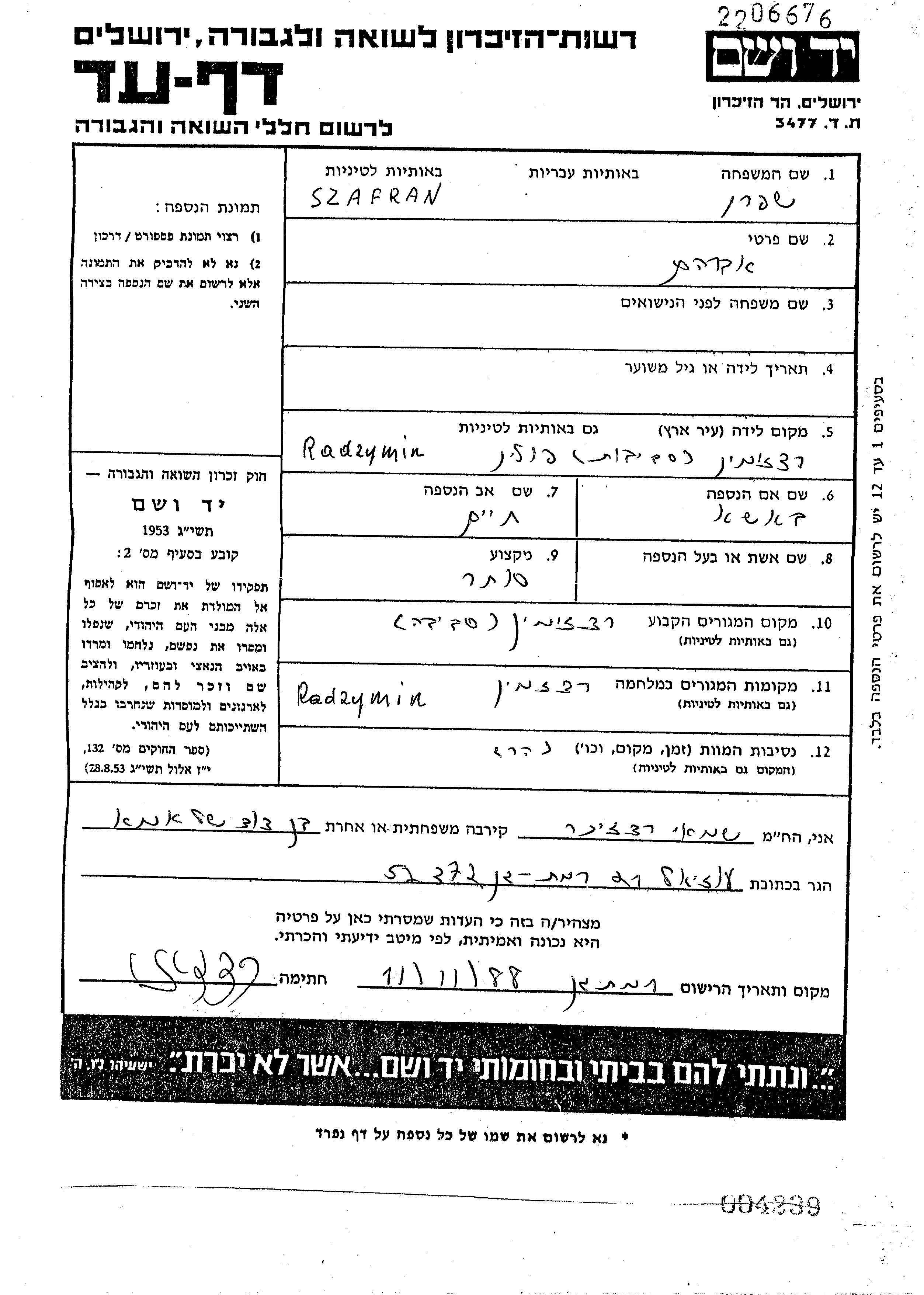 Szafran Abraham Radzymin, Polen Gedenkblatt