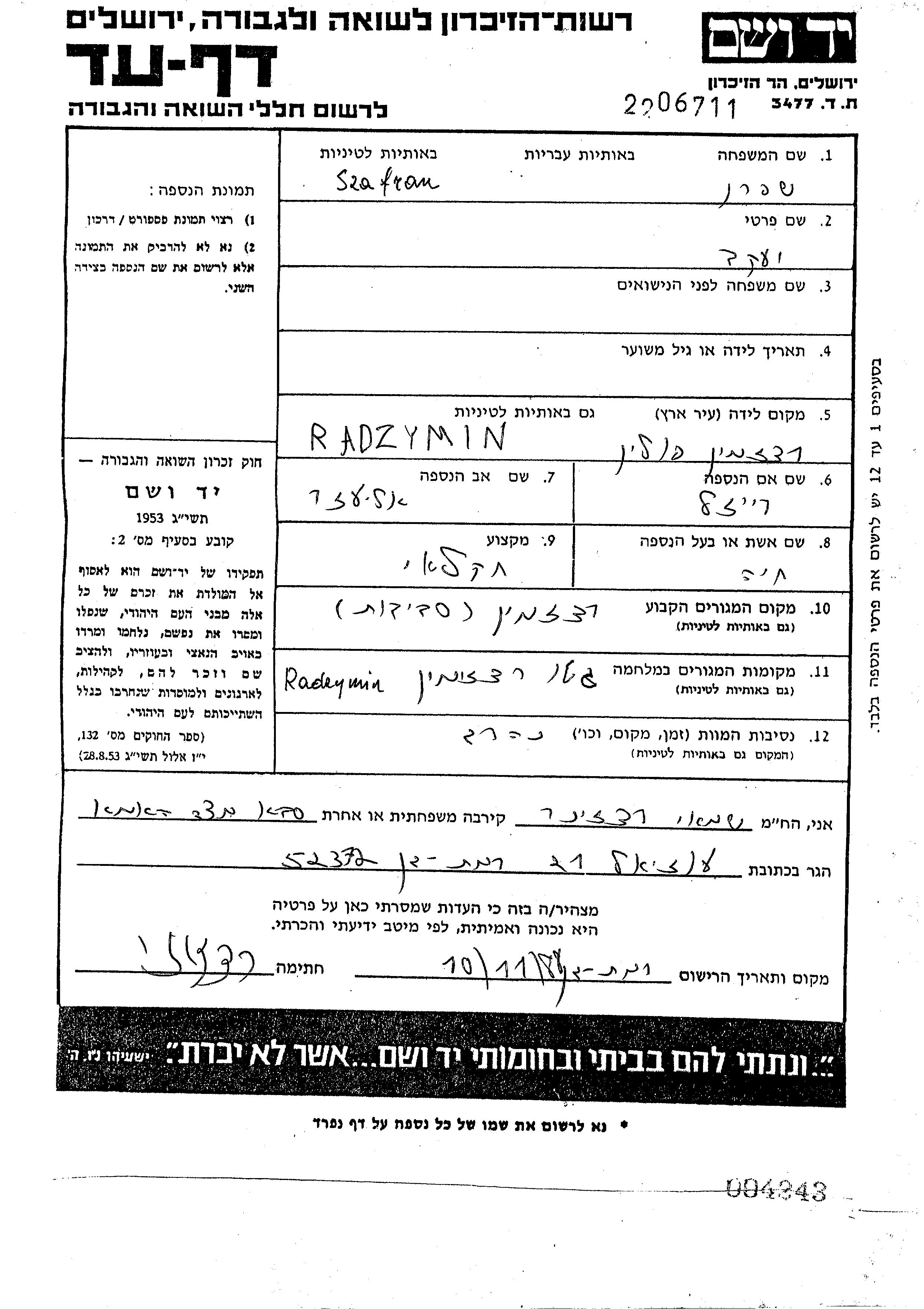 Yacow Szafran wurde in Radzymin, Polen geboren. Er war der Sohn von Eliezer und Reizl. Er war Landwirt und mit Haia Verheiratet. Vor dem Zweiten Weltkrieg lebte er in Radzymin, Polen. Während des Krieges war er in Radzymin, Polen.