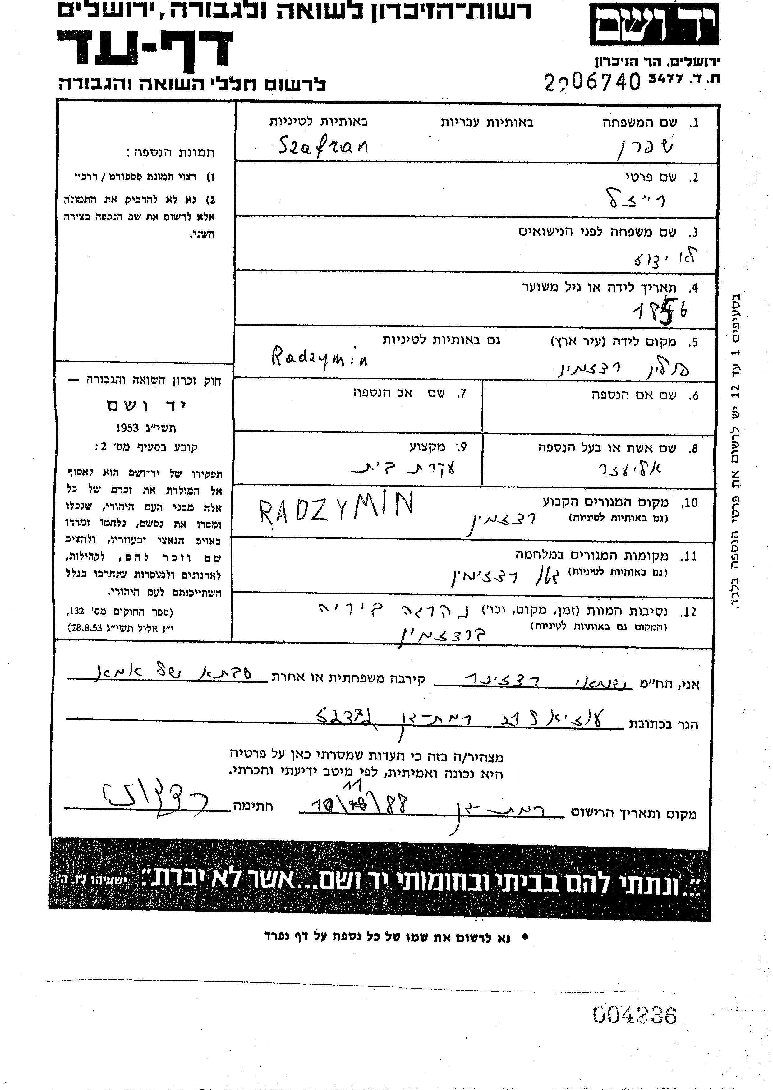Reizl Szafran wurde in Radzymin, Polen geboren. Sie war Hausfrau und mit Eliezer Verheiratet. Vor dem Zweiten Weltkrieg lebte sie in Radzymin, Polen. Während des Krieges war sie in Radzymin, Polen.