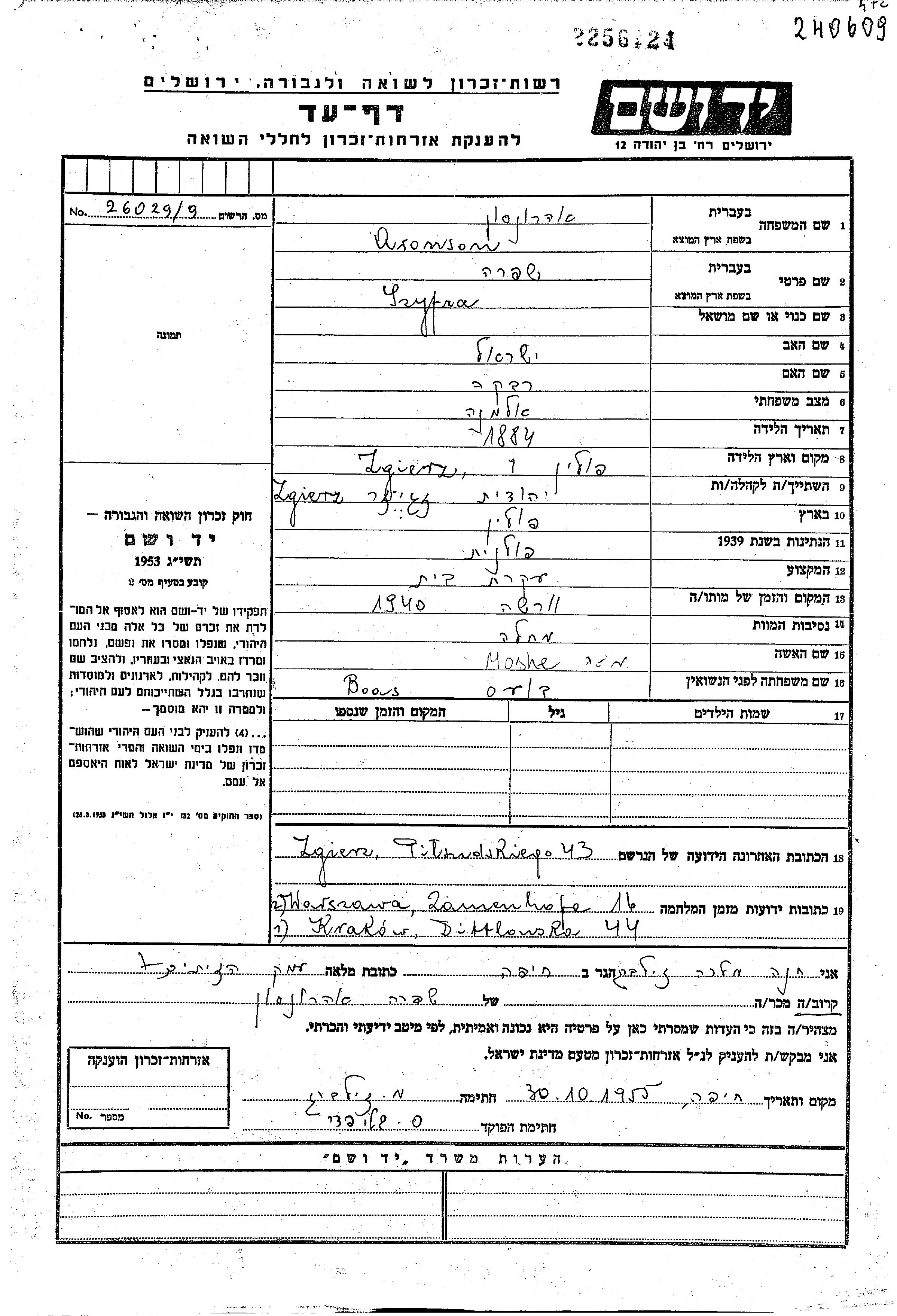 Szyfra Aronson, geb. Boaz wurde im Jahr 1884 in Zgierz, Polen geboren. Sie war die Tochter von Israel und Rivka. Sie war Hausfrau und mit Moshe Verheiratet. Vor dem Zweiten Weltkrieg lebte sie in Zgierz, Polen. Während des Krieges war sie in Krakow, Polen.