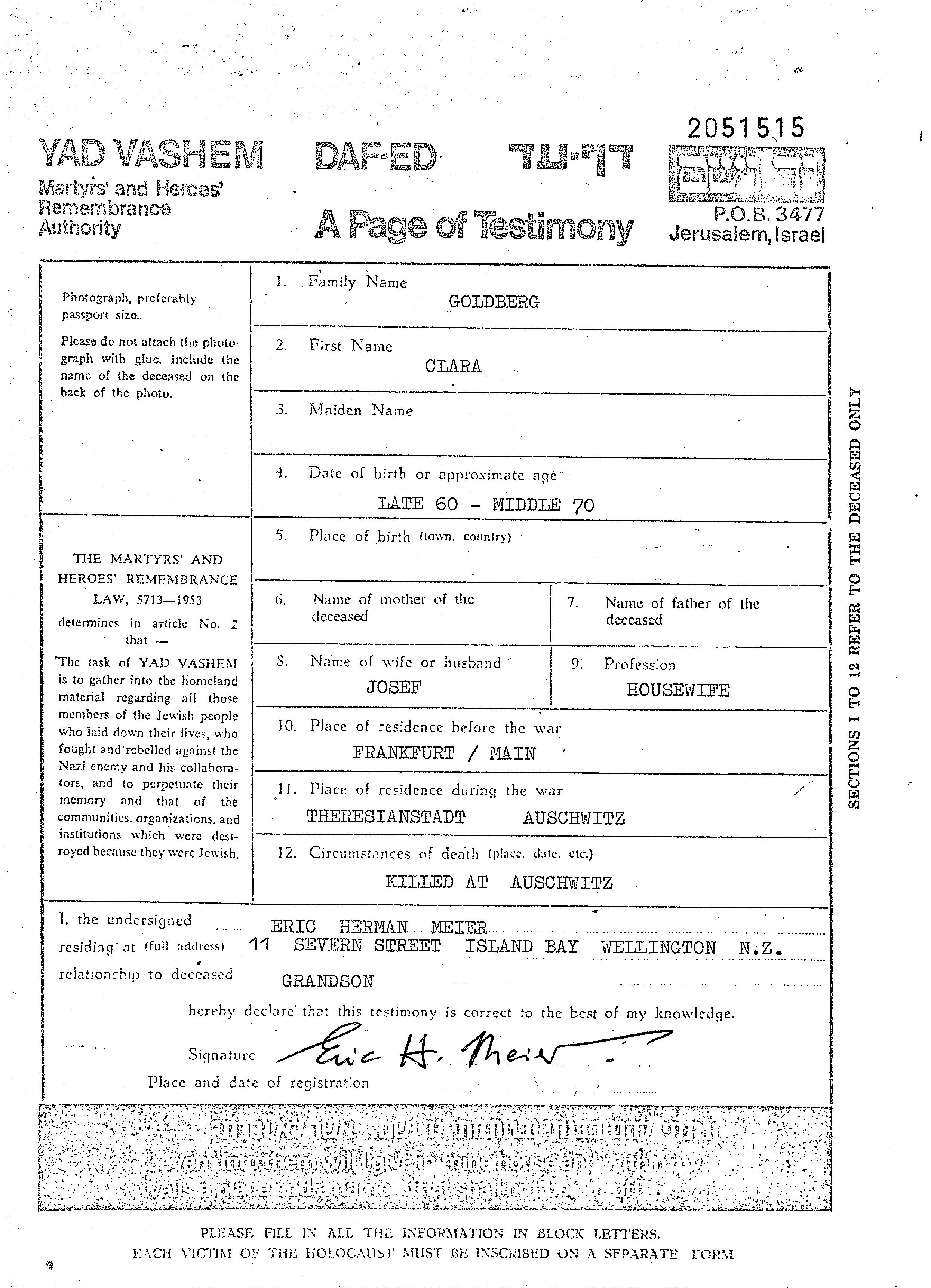 Clara Goldberg. Sie war Hausfrau und mit Josef Verheiratet. Vor dem Zweiten Weltkrieg lebte sie in Frankfurt Main, Deutsches Reich. Während des Krieges war sie in Deutsches Reich.