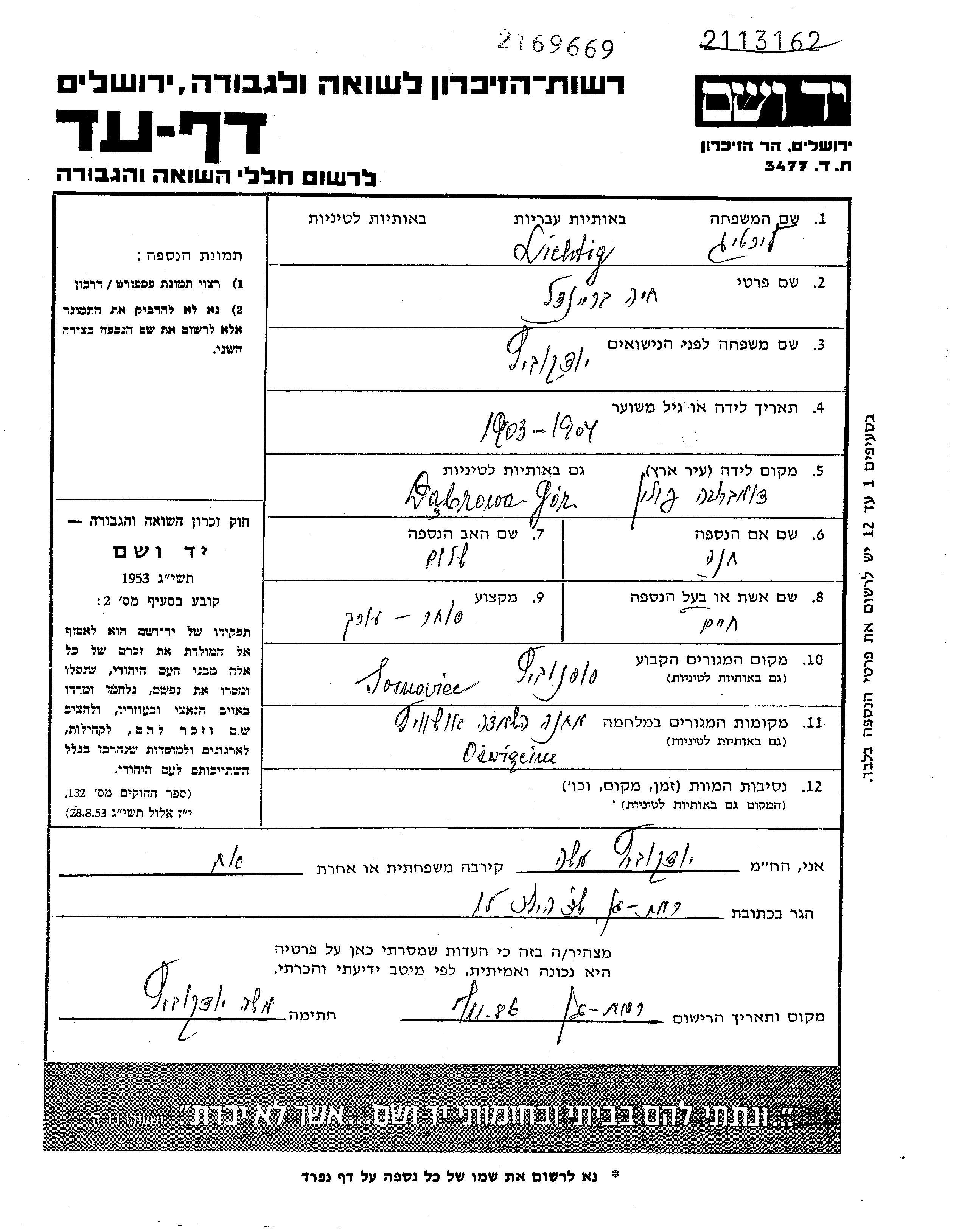 Khaja Braindel Lichtig, geb. Iudkovitz wurde im Jahr 1903 in Dabrowa Gornicza, Polen geboren. Sie war die Tochter von Shalom und Khana. Sie war Kaufmann/-frau und mit Khaim Verheiratet. Vor dem Zweiten Weltkrieg lebte sie in Sosnowiec, Polen. Während des Krieges war sie in Polen.