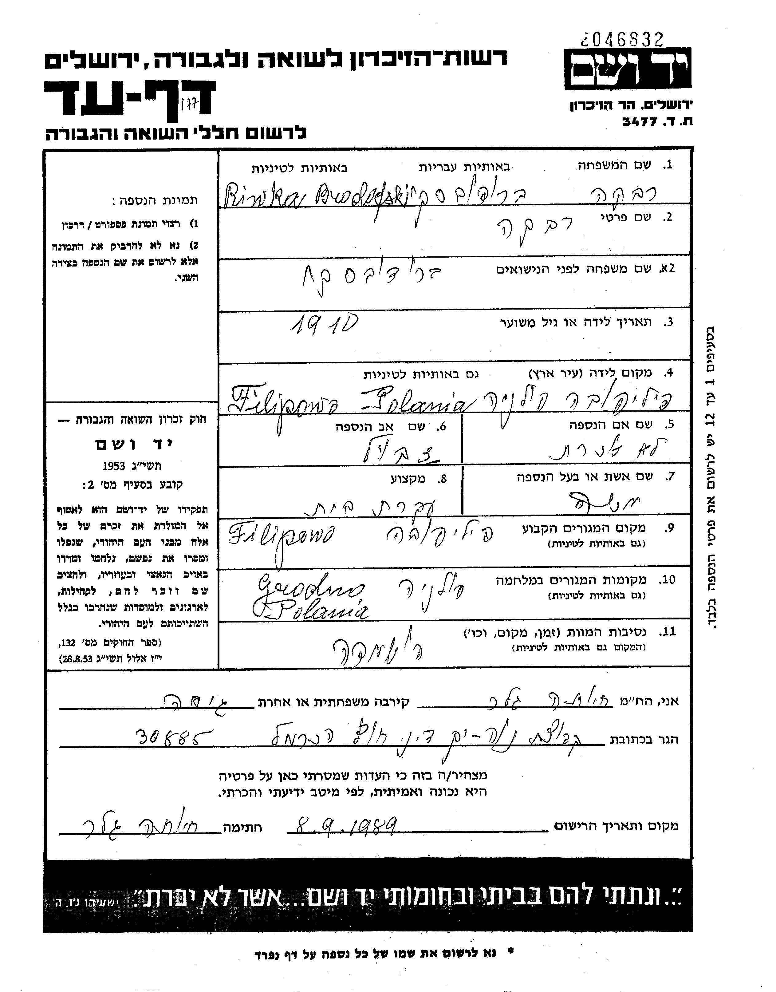 Riwka Brodofski wurde im Jahr 1910 in Filipow, Polen geboren. Sie war die Tochter von Zavul Zavel. Sie war Hausfrau und mit Moshe Verheiratet. Vor dem Zweiten Weltkrieg lebte sie in Filipow, Polen. Während des Krieges war sie in Grodno, Polen.
