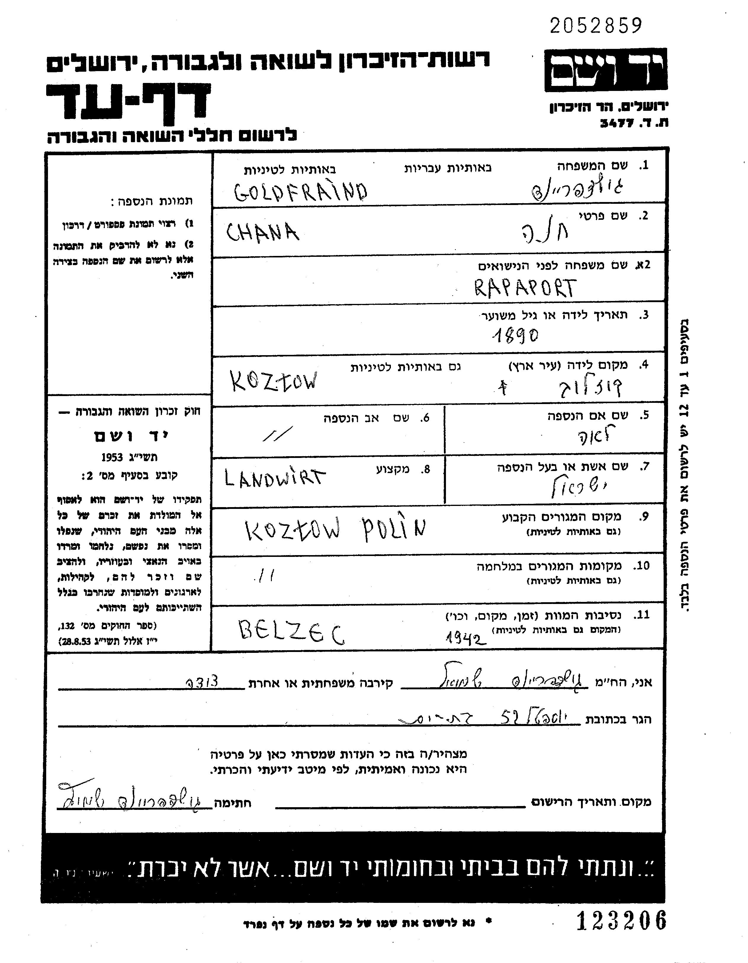 Chana Goldfraind, geb. Rapaport wurde im Jahr 1890 in Kozlow, Polen geboren. Sie war die Tochter von Lea. Sie war Gutsbesitzer und mit Israel Verheiratet. Vor dem Zweiten Weltkrieg lebte sie in Kozlow, Polen. Während des Krieges war sie in Kozlow, Polen.