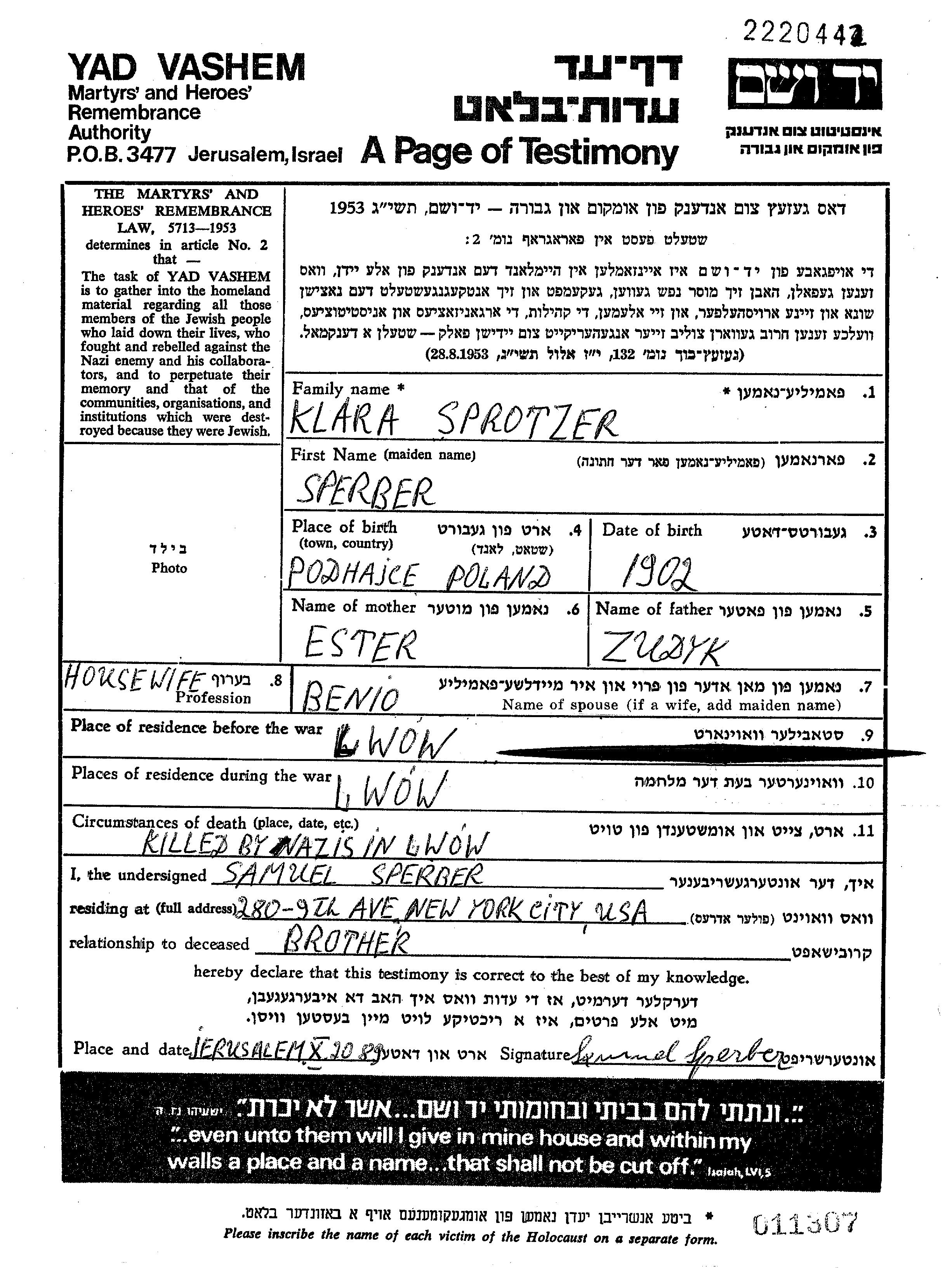 Klara Sprotzer, geb. Sperber wurde im Jahr 1902 in Podhajce, Polen geboren. Sie war die Tochter von Zudyk und Ester. Sie war Hausfrau und mit Benio Benya Verheiratet. Vor dem Zweiten Weltkrieg lebte sie in Lwow, Polen. Während des Krieges war sie in Lwow, Polen.